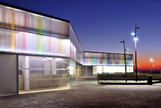La materialidad busca una sensación de liviandad y transparencia, utilizando el vidrio, el policarbonato y el acero. La fachada, compuesta por vidrio en planta baja y una doble piel traslúcida en el nivel superior, se retroilumina por la noche, recreando una extensa franja de luz frente a la bahía.