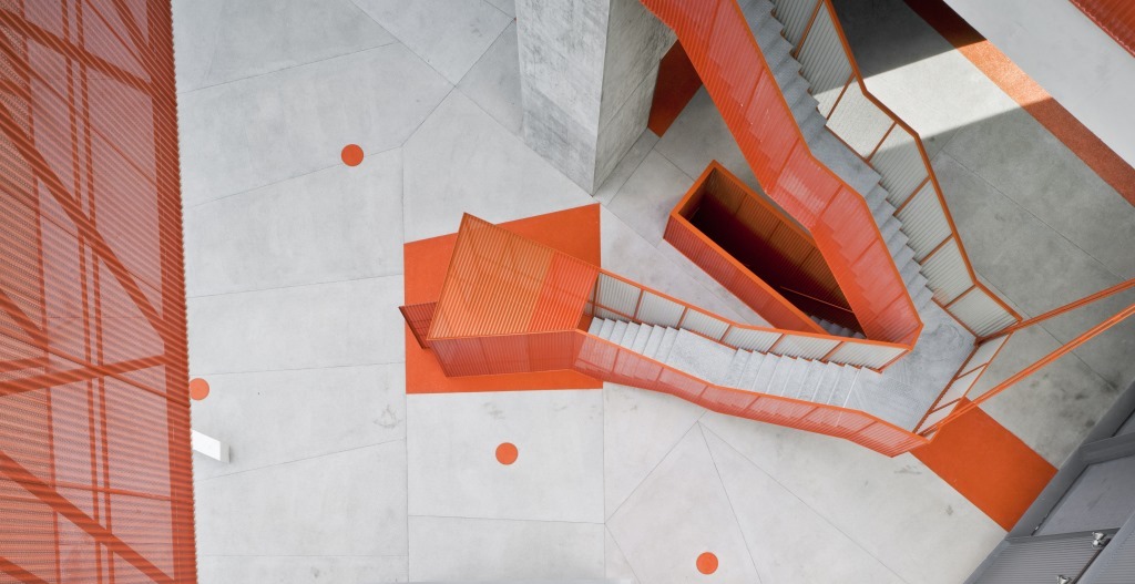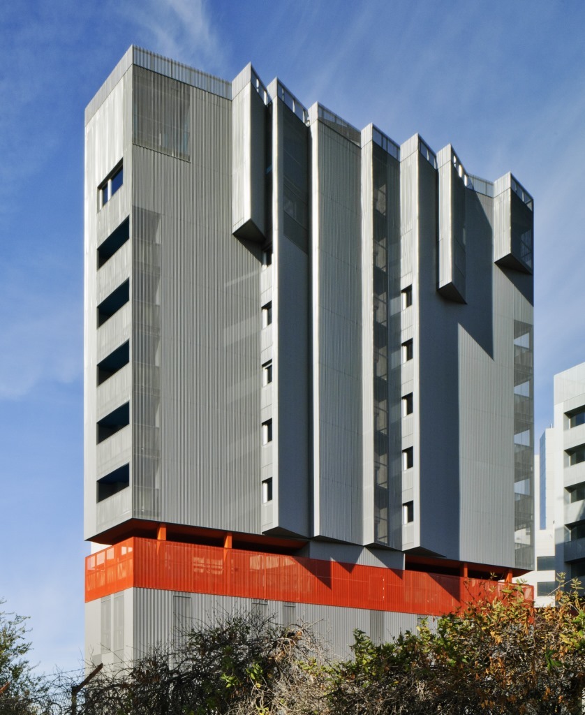 Para revestimiento metálico se usaron las chapas Frequence 14.18 F de ArcelorMittal Construcción, en los colores BRICK 5201, PLATINA 4710 y MOUSE 4752. ArcelorMittal Construction España suministró los 15.500 m2 de esta chapa ondulada que no solamente se utilizó para la fachada exterior sino también para las escaleras, espacios comunes y garajes.