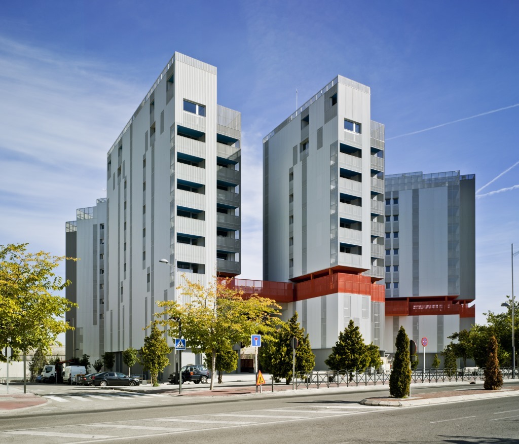No es muy comun ver fachadas metálicas en edificios de vivienda en España ya que existe una cierta tradición que prefiere el uso de ladrillo, hormigón o materiales cerámicas para este tipo de construcciones. El complejo arquitectónico de Coslada demuestra de manera innovadora que las carácteristicas estéticas y funcionales del acero no solo convencen en edificios industriales en las que su uso está mucho más extendido.