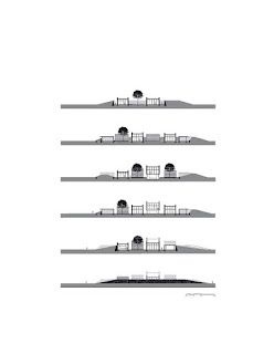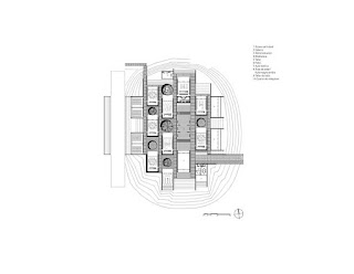 El acceso principal permite la lectura distorsionada del conjunto desde el exterior con una escala aparentemente pequeña para sorprenderte con una escala de edificios de 4, 5 y 6 metros de altura, ayudando en su volumetría a la lectura en perspectiva de un caparazón virtual al exterior. Todos los taludes se convierten en accesos informales permitiendo un juego de percepción de la volumetría siempre distinto.