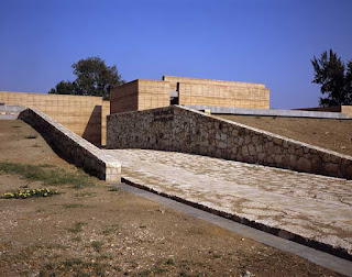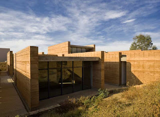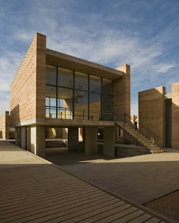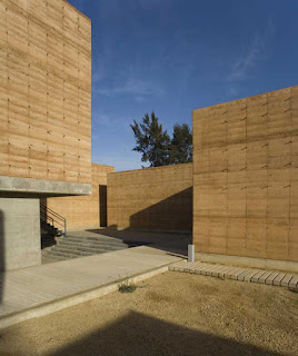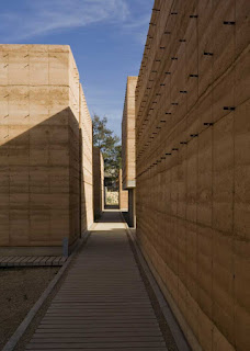 La segunda tipología es la de los edificios exentos a los taludes, todos ellos orientados al norte, a excepción de la galería y el aula magna (norte-sur), construidos en tierra compactada (mezcla de tierra con 15%de cemento), procedimiento que no solo nos ayudaba a la plástica y carácter del edificio (un sistema orgánico y lleno de accidentes que alimenta la riqueza de cada muro) que queríamos lograr sino que además resolvía exitosamente los tiempos requeridos de obra así como una excelente climatización natural. El espesor de estos muros (de 60 a 70 cms) logra crear un microclima óptimo para las condiciones extremas de la ciudad de Oaxaca así como un excelente control acústico. Además del sistema constructivo, los talleres se diseñaron con accesos esbeltos en sus costados y enormes ventanales al norte que permiten el flujo cruzado del viento, dotándolos de la mejor calidad lumínica y extendiendo el espacio interior a través de un pórtico a un espacio de iguales proporciones pero abierto como un espacio de trabajo al aire libre. Estos patios fueron una premisa importante para conformar una planta ajedrezada donde el vibrado de masa-vacío en los distintos andadores se convirtió en la conformación de recorridos y fugas visuales siempre distintas.