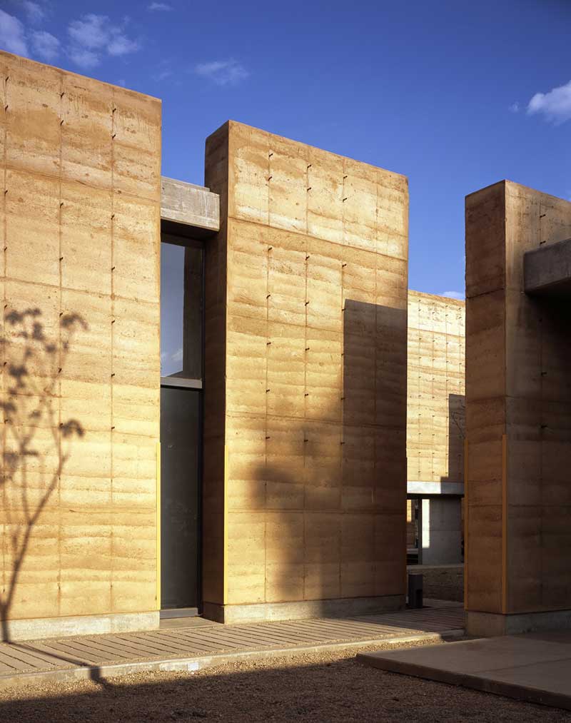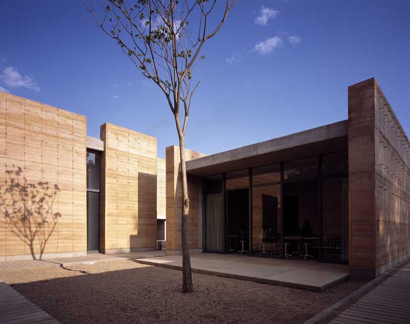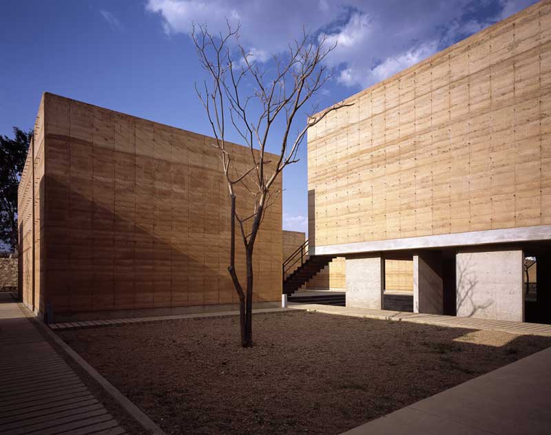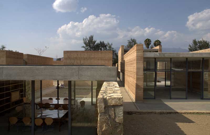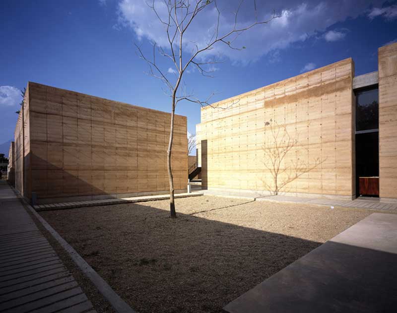 La segunda tipología es la de los edificios exentos a los taludes, todos ellos orientados al norte, a excepción de la galería y el aula magna (norte-sur), construidos en tierra compactada (mezcla de tierra con 15%de cemento), procedimiento que no solo nos ayudaba a la plástica y carácter del edificio (un sistema orgánico y lleno de accidentes que alimenta la riqueza de cada muro) que queríamos lograr sino que además resolvía exitosamente los tiempos requeridos de obra así como una excelente climatización natural. El espesor de estos muros (de 60 a 70 cms) logra crear un microclima óptimo para las condiciones extremas de la ciudad de Oaxaca así como un excelente control acústico. Además del sistema constructivo, los talleres se diseñaron con accesos esbeltos en sus costados y enormes ventanales al norte que permiten el flujo cruzado del viento, dotándolos de la mejor calidad lumínica y extendiendo el espacio interior a través de un pórtico a un espacio de iguales proporciones pero abierto como un espacio de trabajo al aire libre. Estos patios fueron una premisa importante para conformar una planta ajedrezada donde el vibrado de masa-vacío en los distintos andadores se convirtió en la conformación de recorridos y fugas visuales siempre distintas.
