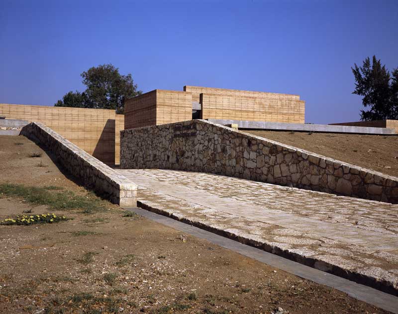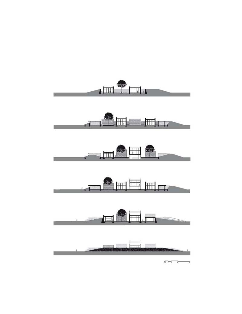El acceso principal permite la lectura distorsionada del conjunto desde el exterior con una escala aparentemente pequeña para sorprenderte con una escala de edificios de 4, 5 y 6 metros de altura, ayudando en su volumetría a la lectura en perspectiva de un caparazón virtual al exterior. Todos los taludes se convierten en accesos informales permitiendo un juego de percepción de la volumetría siempre distinto.