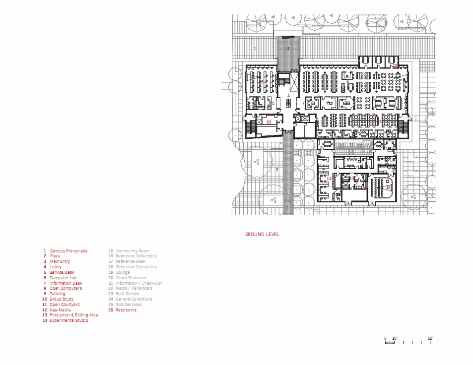 The approach and entrance to the building moves visitors through a series of transitional spaces. First, they cross under a suspended installation that establishes a gateway to the campus while reinforcing the entrance to the LRC. Once in the lobby, the space expands into a double height volume that allows a visual and physical connection to the library located on the second floor.