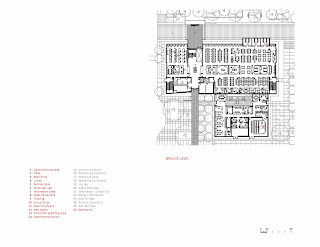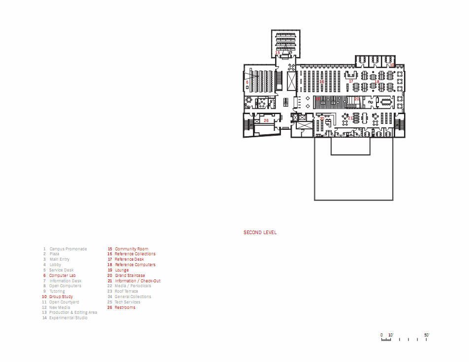 As visitors circulate vertically through the lobby, they arrive at another threshold bringing them to the main library entrance. Upon crossing this entry, is a second double height volume within the building. This area connects the second level to the third, acting as the primary circulation between floors.