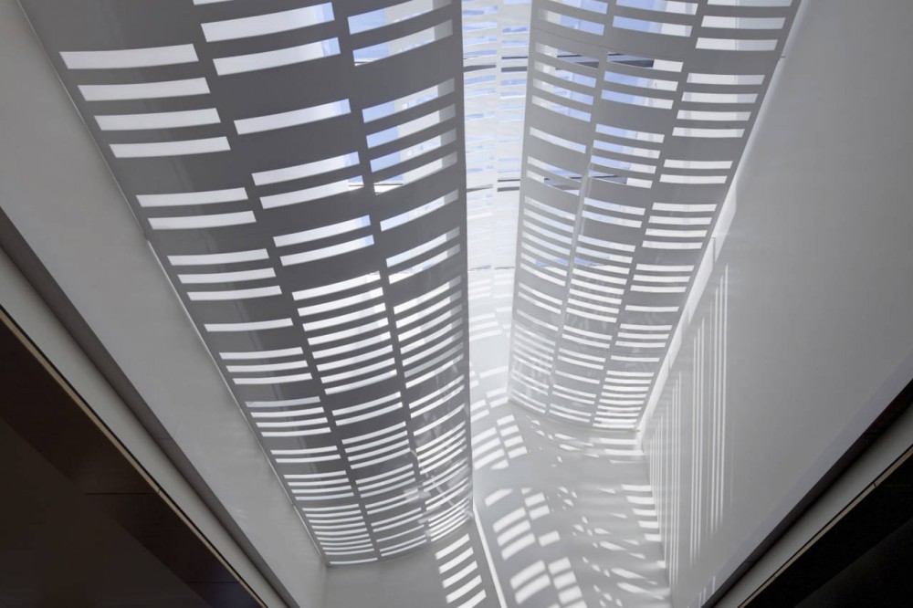 Once inside, there is a natural organization to the various library sections created by the layering of quiet, collaborative, social and private zones of the floor plan. These are further enhanced by the abundance of high quality natural lighting made possible by maximizing the building’s northern exposure. In order to leverage the natural lighting on the east and the west facades, while minimizing solar heat gain, the glazing units have an integrated, expandable metal skin on the innermost layers.