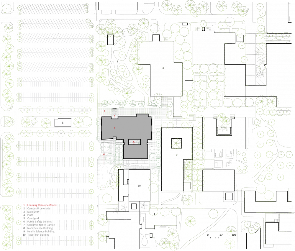 The Golden West College Learning Resource Center (LRC) incorporates 50,000 sq. ft. of general collection space for approximately 65,000 volumes, an Information Commons for tutoring and instructional support, a New Media wing, and community-accessible spaces for meetings. This state-of-the-art facility will not only consolidate campus resources, but also support the learning process by providing increased computer access for both students and staff.