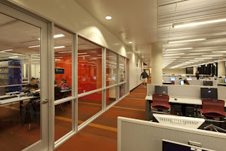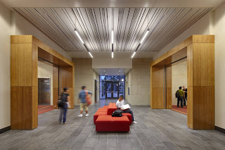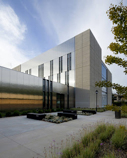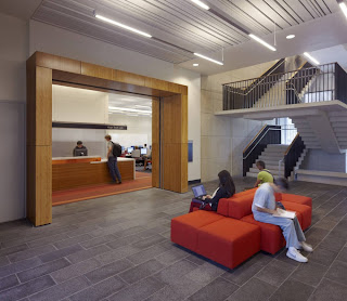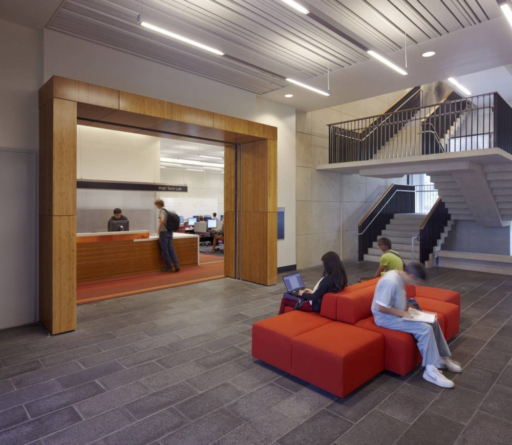 Architecturally, the building uses a simple palette of architectural concrete, stainless steel metal panels and glass for the exterior envelope. The interior’s exposed concrete is complemented by the use of bamboo flooring and wall panels, and through the use of vibrant color on both the flooring and furniture.