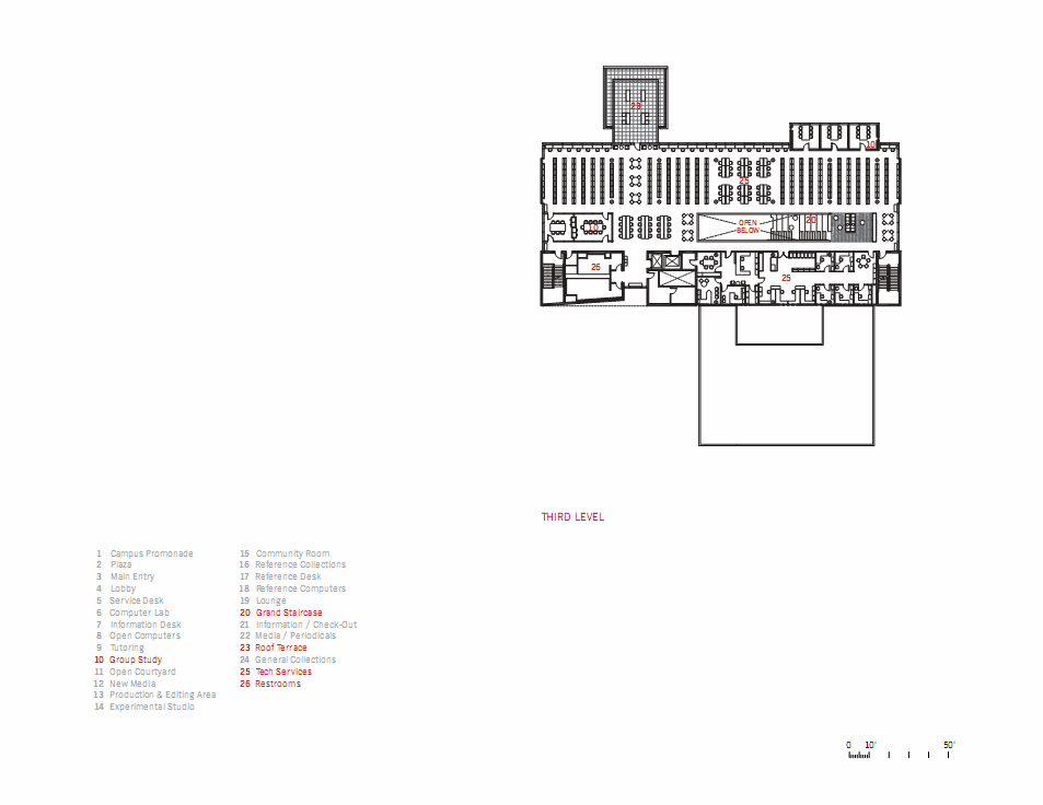 This portion of the library is highlighted further by the large communal seat stair for informal gatherings and presentations, as well as four large skylights that help bring natural lighting into the center of the building. The combination of these three elements — volume, communal gathering and natural lighting — create a very dramatic experience upon entering the library.