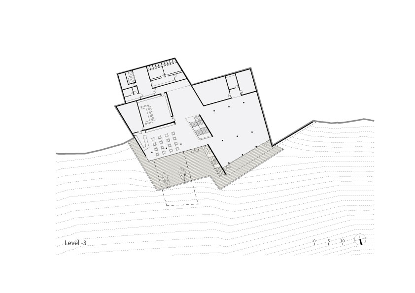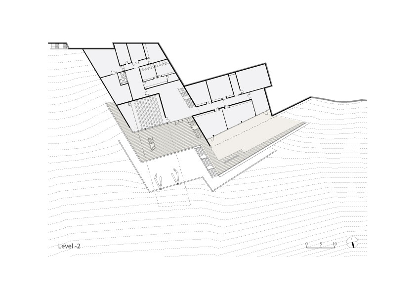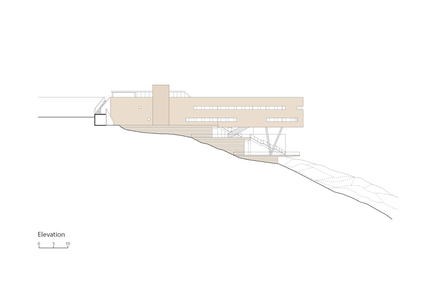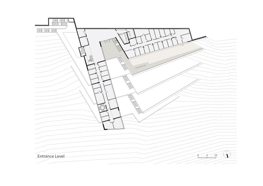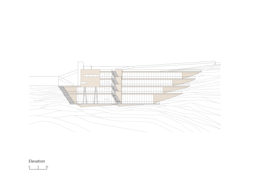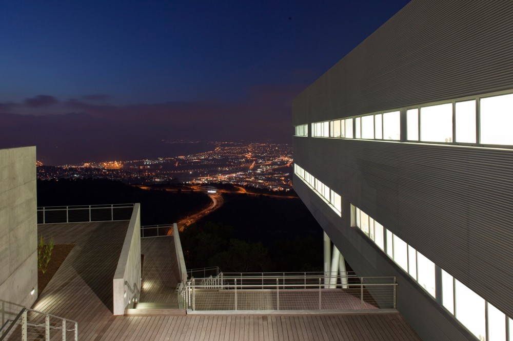 The design of the building aim to fulfill two main goals: integration of the building into the natural surrounding landscape on one hand, and functional clarity on the other hand. This clarity was achieved by separating the two main activates: the Dean of Students offices and the student union into two wings with differing characteristics of space, volume and operational organization. The Dean of Students wing is a two- store rectangular prism, perpendicular to the lines of the topography and jutting out into the vista. Its roof acts as an extension of the scenic road with an observation deck at its end. The Students Union wing is a semi buried four- store-stepped structure shaped like a fan with its long glazed façade facing the view. The upper floors contain the offices while the lower floors the public activities. The garden roofs of the terraced wing blend with the adjacent topography of the mountain.
