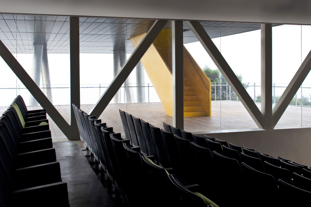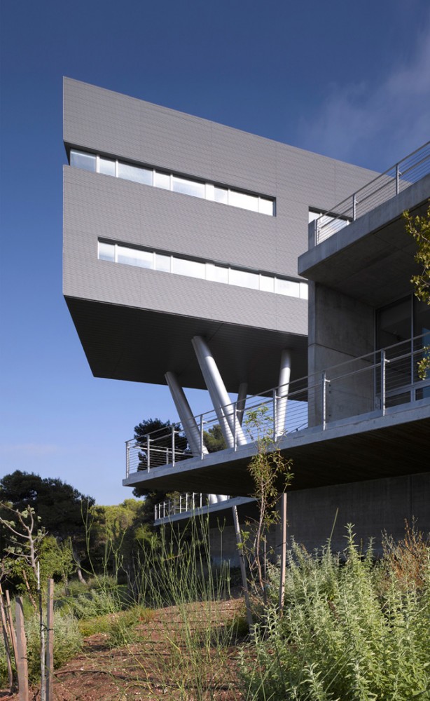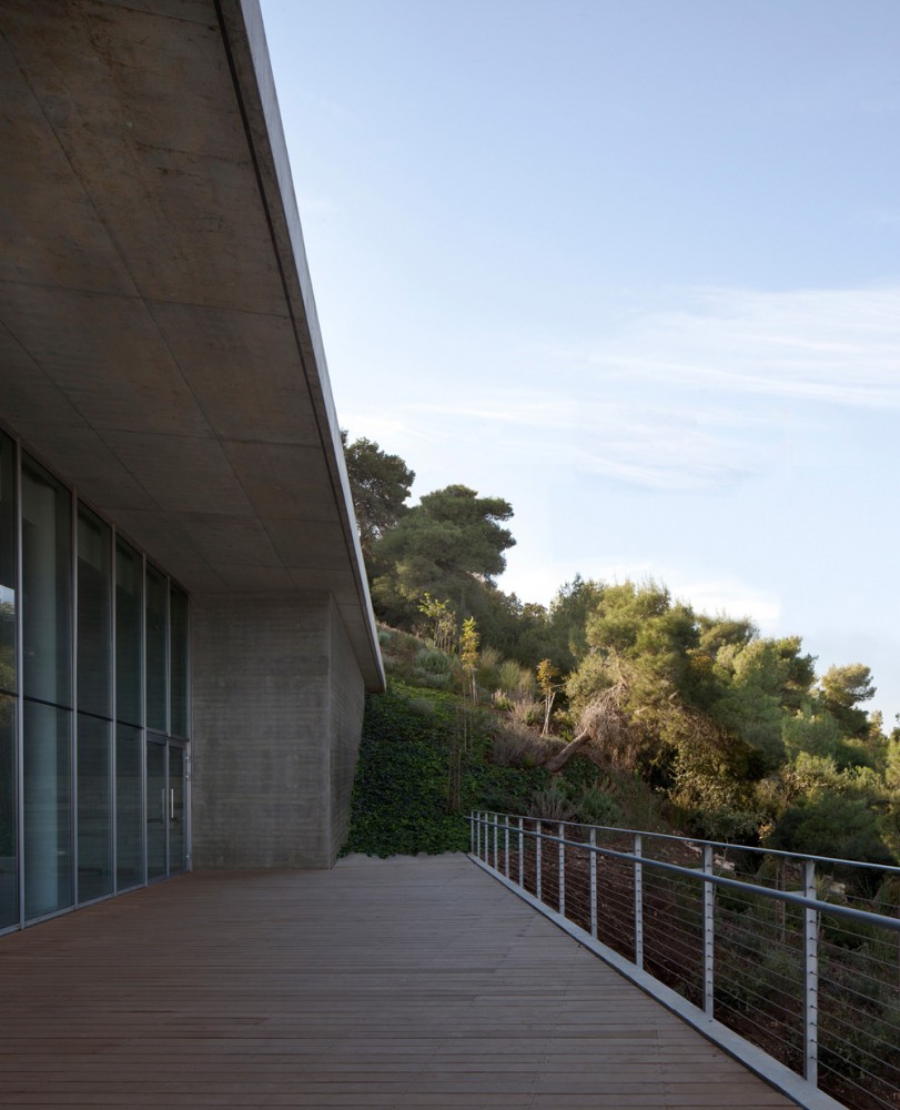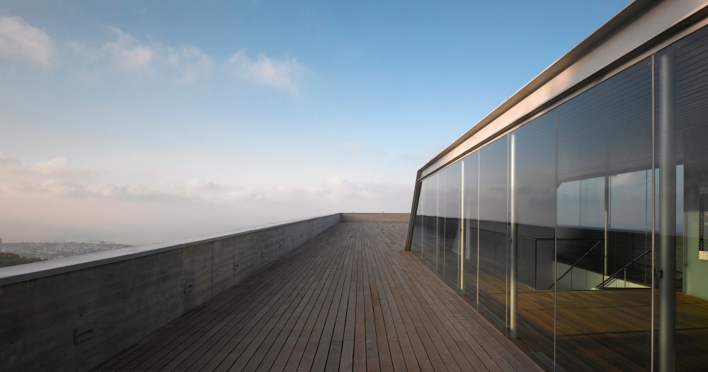 Haifa University is built on the projection of a ridge of Mount Carmel that looks over the bay of this Mediterranean city. The site chosen for the Student Center building overlooks a deep valley as well as the bay and has a steep topography. Its upper part abuts the scenic road that extends through the entire campus, ending at the site. In order not to interfere with the view, the building’s roof had to be set below the level of the scenic road.