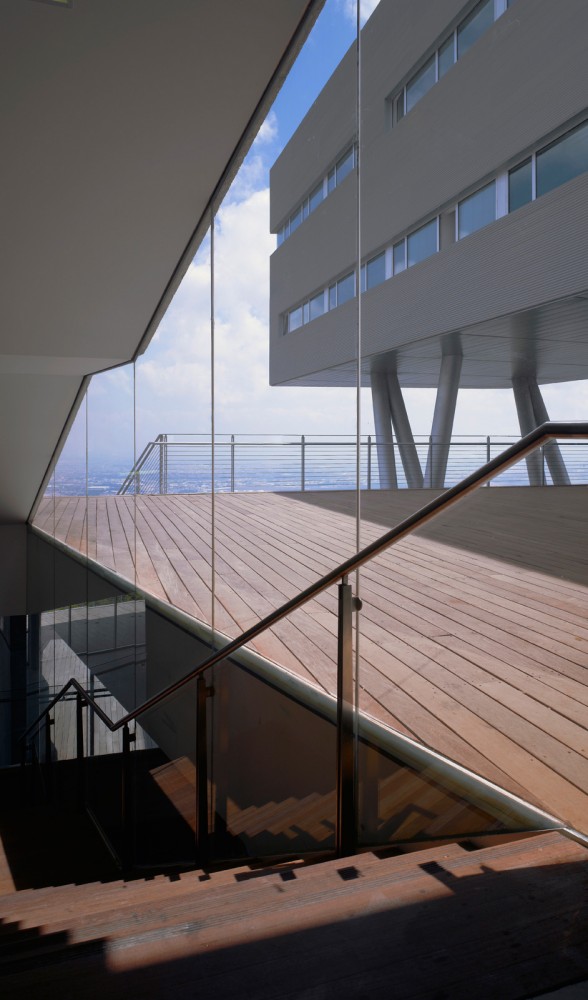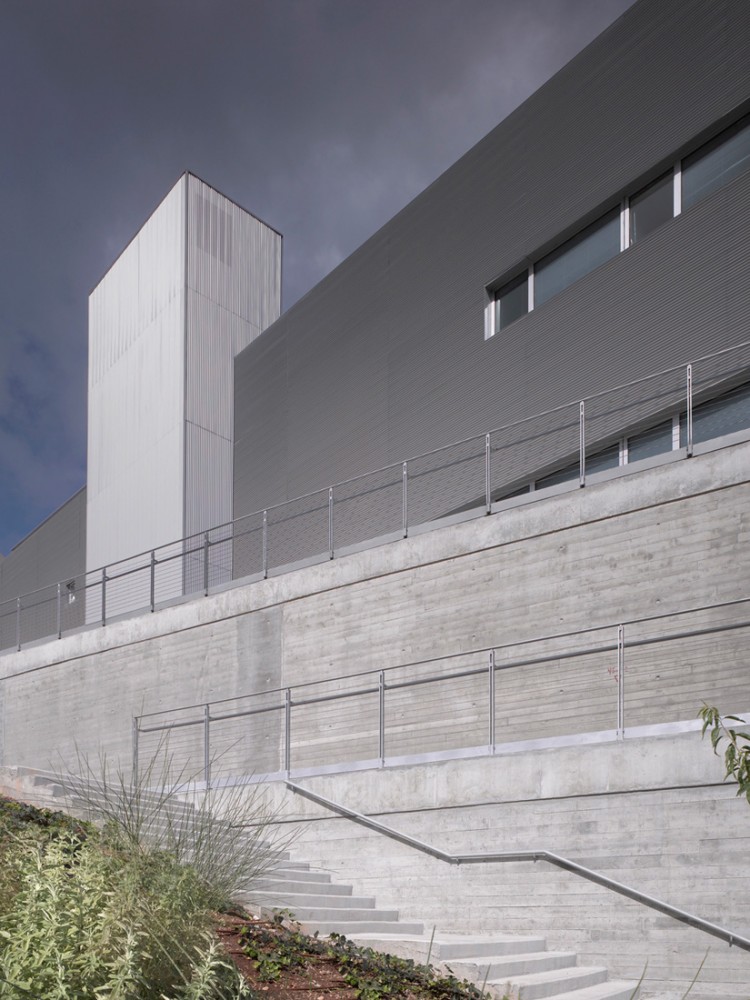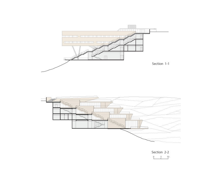 The finishing materials for the building express the relationship between the two wings that comprise it. The floating Dean’s wing is designed with metal cladding while the earthy terraces walls are built of exposed concrete. The floating wing roof and the external stepped street leading to the terraced gardens are paved with wooden deck. The terraces extend underneath the floating wing and vanish into the topography, unifying both wings into a singular comprehensive architectural composition.