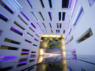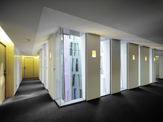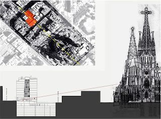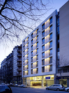 By this operation, not only a roof terrace with breathtaking views on the heights of the SagradaFamilia could be created, but yet entering the hotel mall the visitor becomes aware of the powerful presence of the monument. We wish to believe that in this precise moment volatiles sensations are transformed to an enduring experience, due to an effort of locating our building, its outfit and inner reality, in a meaningful position towards history and place.