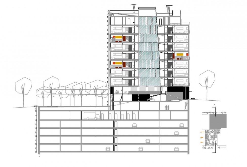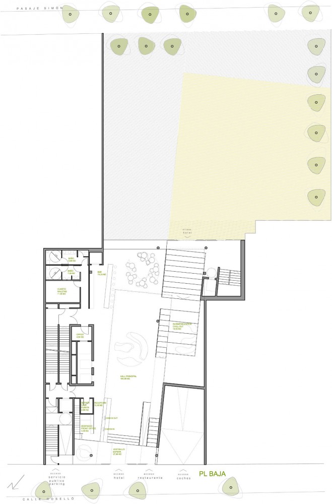 It is only another vantage for the challenge of raising up a project in the neighborhood of a world famous incunabula of international tourism that we were allowed, just adopting the section of our building to the slightly slope of the preexisting plot of land, to create a public plaza in the interior of the block, accessible from the hotel bar at the ground floor. In the counterpart of financing the investment for the public space, we were permitted to demolish the shabby and neglected two-storey constructions along the inner passage, bringing their floor area up to the top of the hotel building.