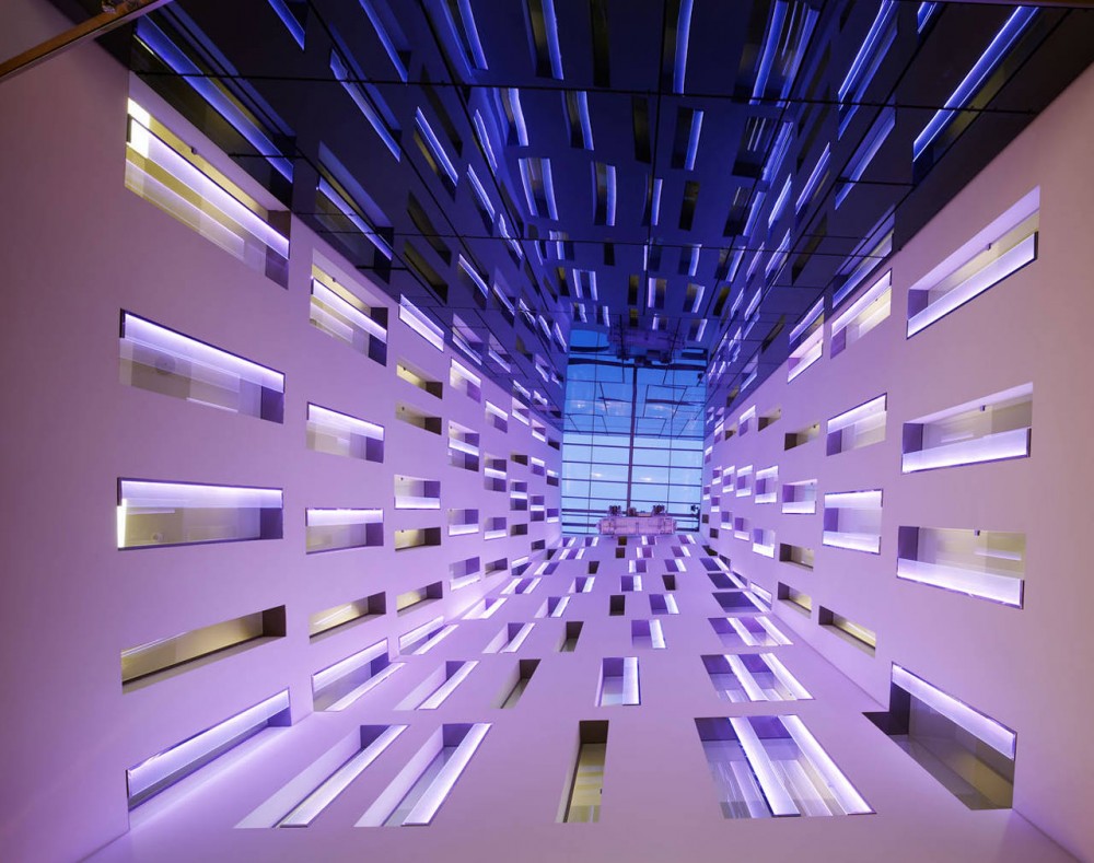 In a simple but effective gesture, we broke up the stone panels between adjacent guest apartments, filling the void with thin alabaster tiles attached to laminated glass slabs, which measures were scaled by the Fibonacci Series. Opaque during the day, they become translucent at night, following the sequence of the visitors lighting their rooms. Therefore the facades become the animated showcase of the building’s activity.
