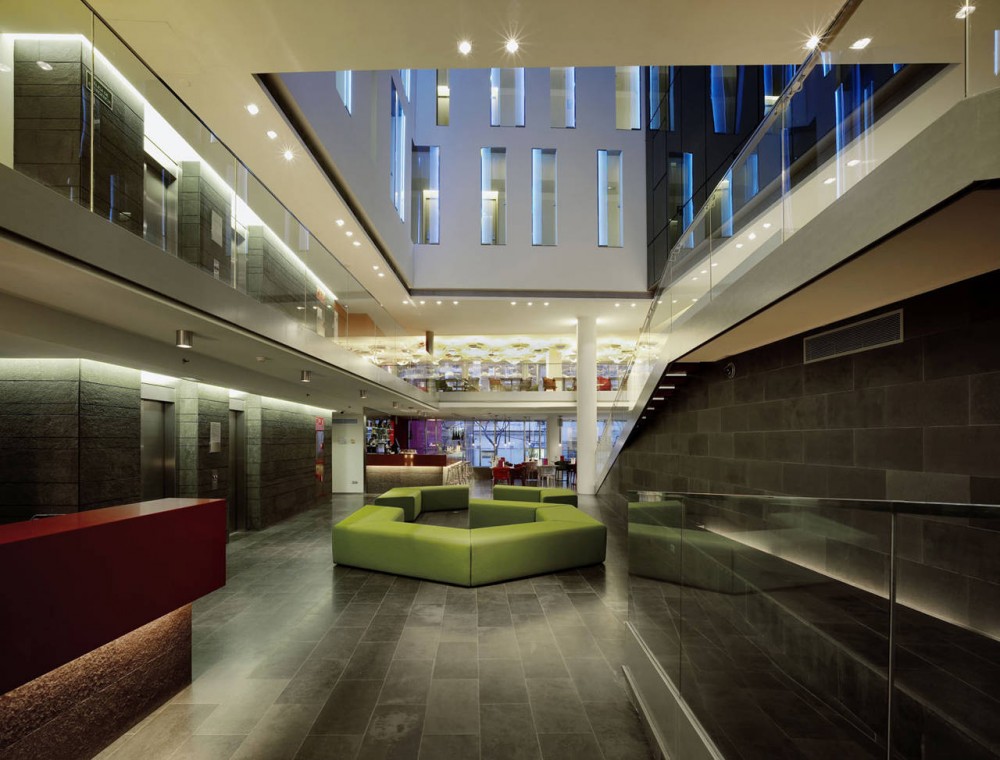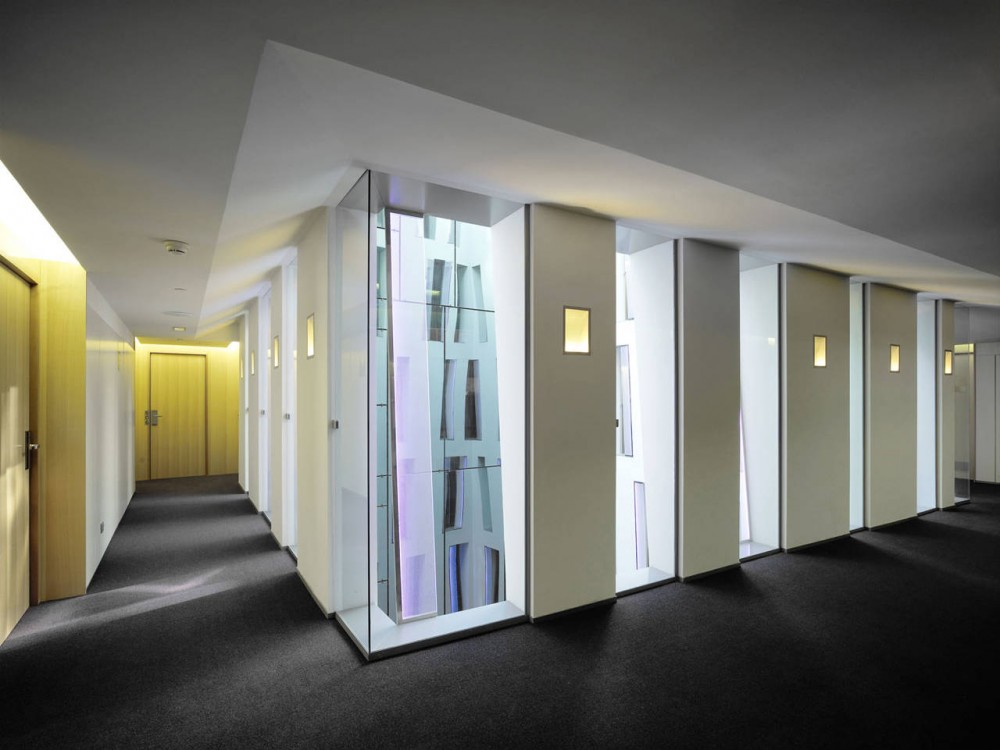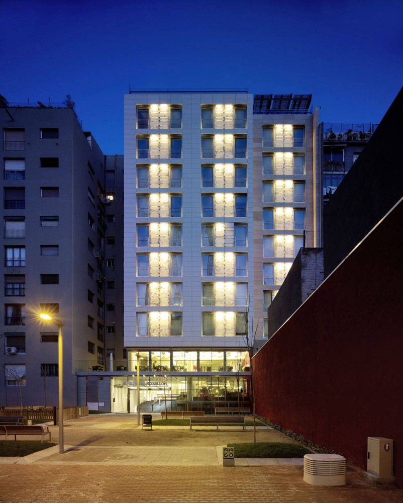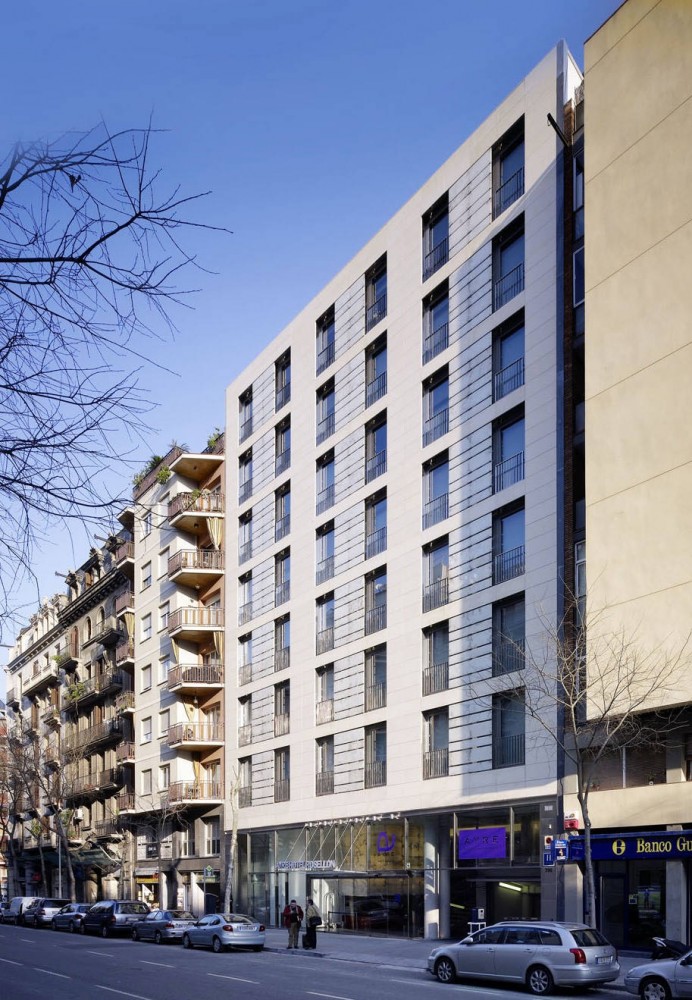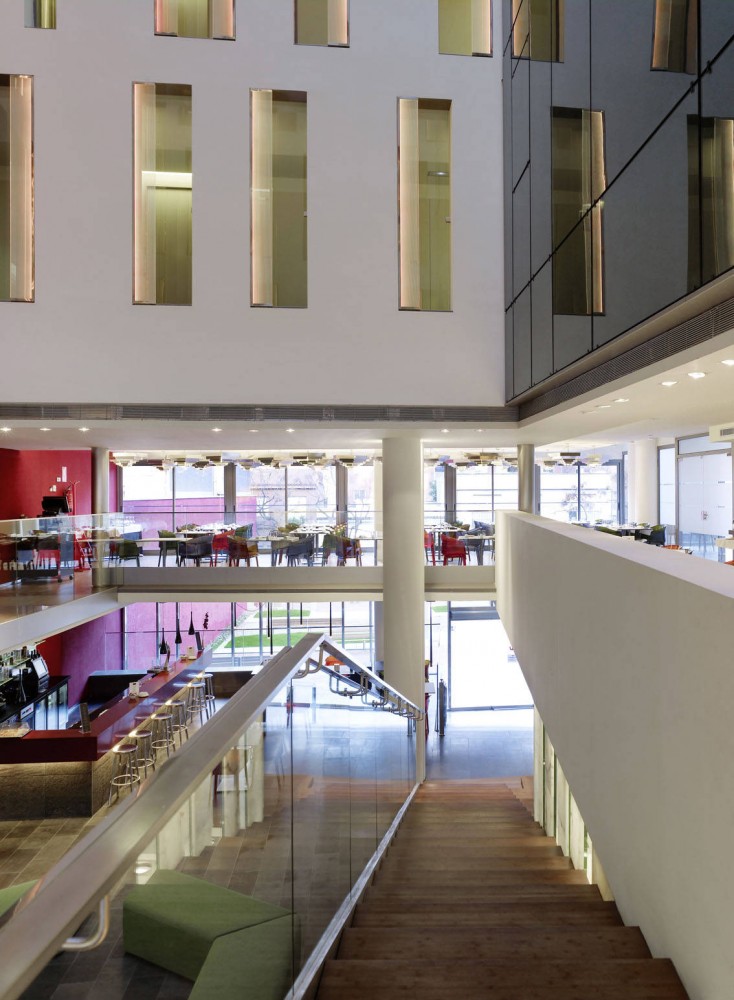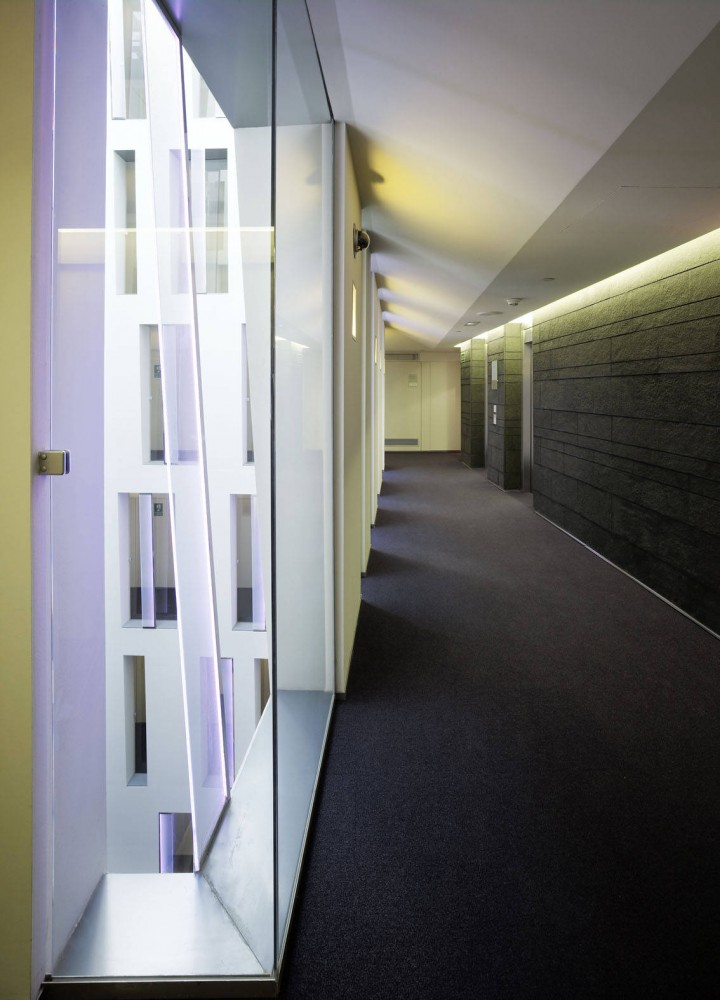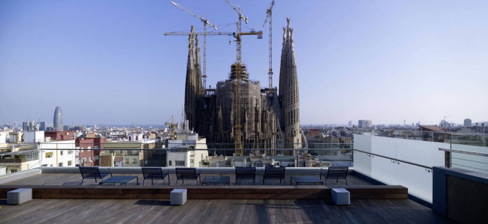 By this operation, not only a roof terrace with breathtaking views on the heights of the SagradaFamilia could be created, but yet entering the hotel mall the visitor becomes aware of the powerful presence of the monument. We wish to believe that in this precise moment volatiles sensations are transformed to an enduring experience, due to an effort of locating our building, its outfit and inner reality, in a meaningful position towards history and place.