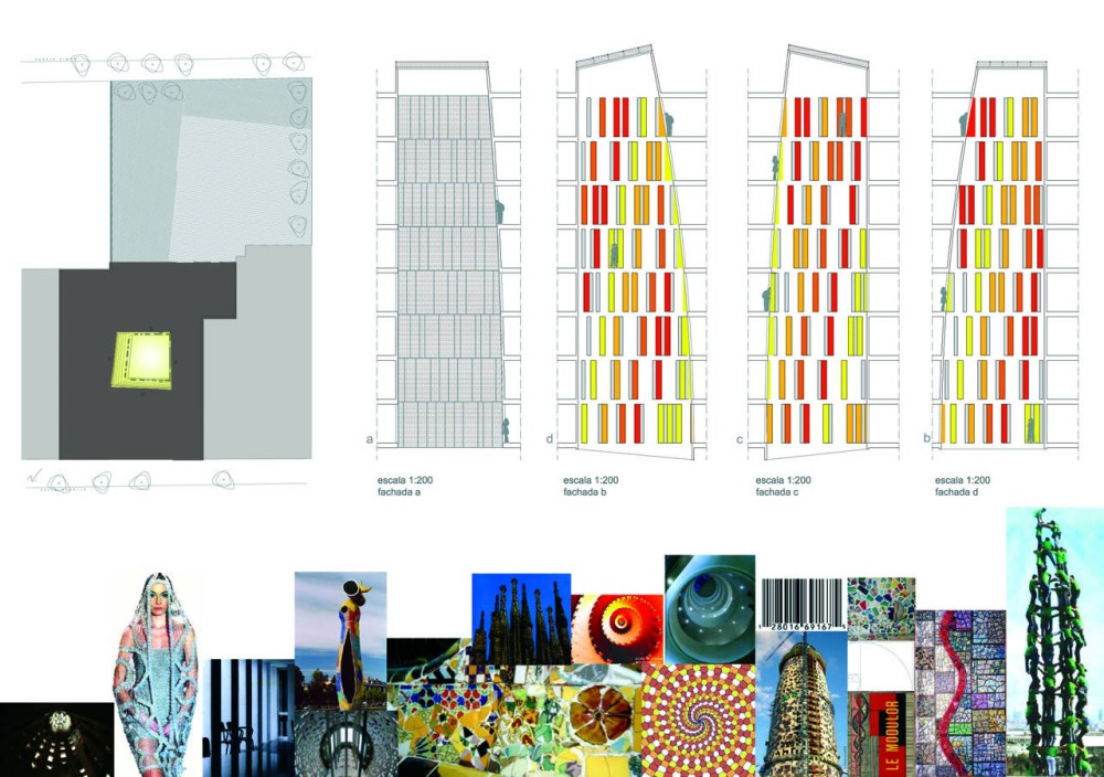 To be confronted with a building site in the shadow of the “SagradaFamilia“ a key work of the Catalan master AntoniGaudí, is an unique opportunity in the life of an architect. We were perfectly aware that the particular modernist style – to be read as a Catalan version of Art Nouveau – influenced by surrealism, the colorful ornaments reflecting organic elements taken out of nature, as well as the daring structure of the cathedral, represents for the city of Barcelona the same overwhelming attraction as the Frank Gehry`s Guggenheim Museum for Bilbao.
