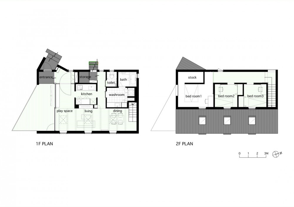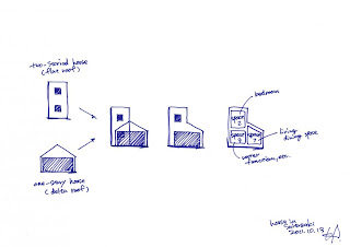 Here, keeping an awareness of orientation and road connections, but without paying special attention the site geometry, two anonymous architectural volumes (a typical one-story gable and a two-layer box) are bound together leaving the simple internal structures intact.v