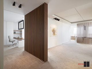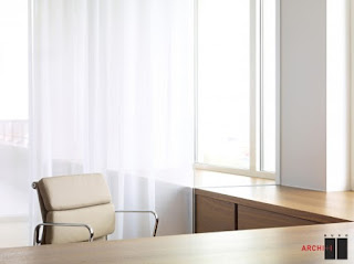 This design adds a professional touch to a homelike interior. A natural extension to this smart design philosophy was to use materials like wool carpeting, to let cabinets run beneath windows in walnut veneer and to blend in some art elements.