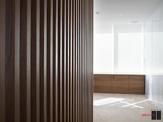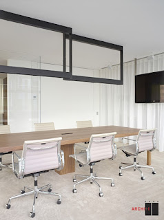 Glass partitions and walnut beams divide up distinct areas. The entrance with washrooms leads to the central area. System components and indirect lighting have been tucked away in the central area’s ceiling. To the right, behind closed white panels, there are filing cabinets and the copier/coffee corner with kitchenette. Behind another panel is an unobtrusive emergency exit. Although two offices have been segregated, they retain lines of sight thanks to the use of glazing. A large pivoting door provides access to the conference room that adjoins a patio. There are also a number of workstations.