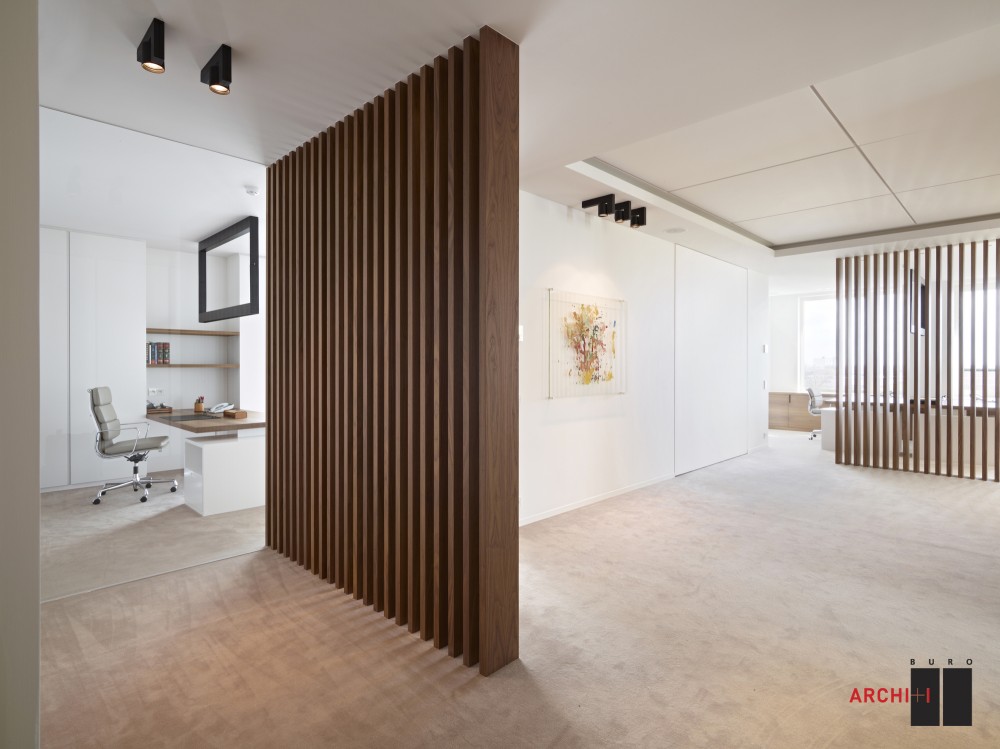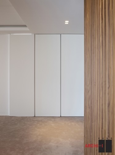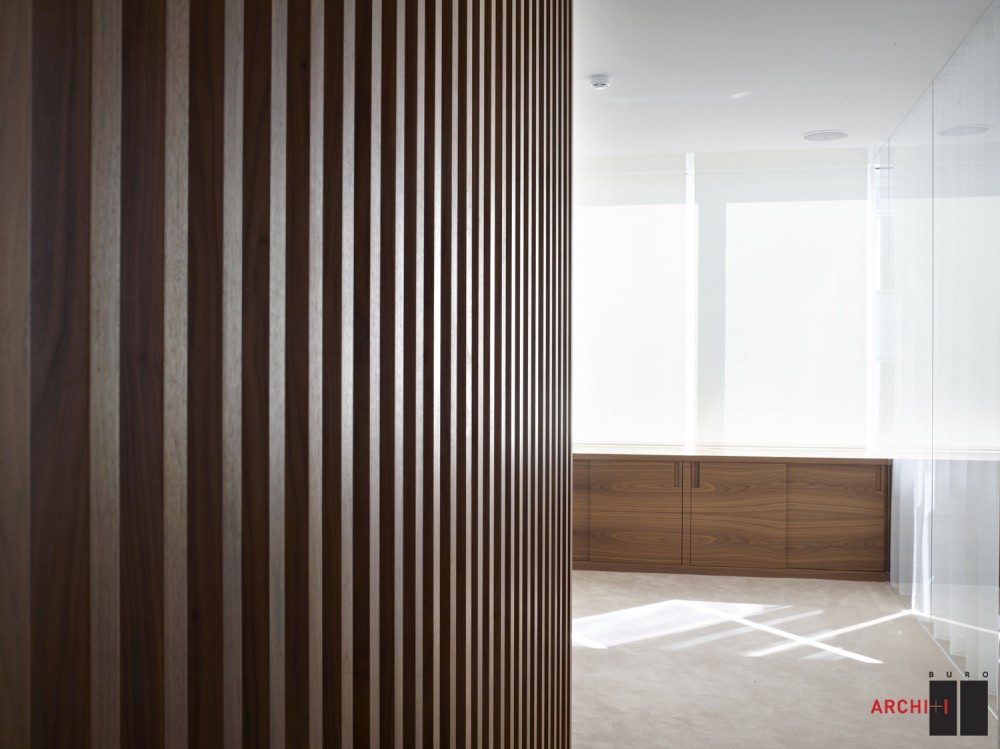 Glass partitions and walnut beams divide up distinct areas. The entrance with washrooms leads to the central area. System components and indirect lighting have been tucked away in the central area’s ceiling. To the right, behind closed white panels, there are filing cabinets and the copier/coffee corner with kitchenette. Behind another panel is an unobtrusive emergency exit. Although two offices have been segregated, they retain lines of sight thanks to the use of glazing. A large pivoting door provides access to the conference room that adjoins a patio. There are also a number of workstations.