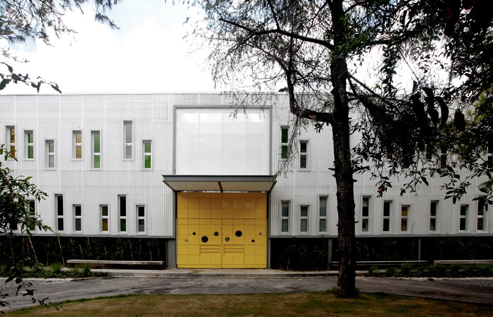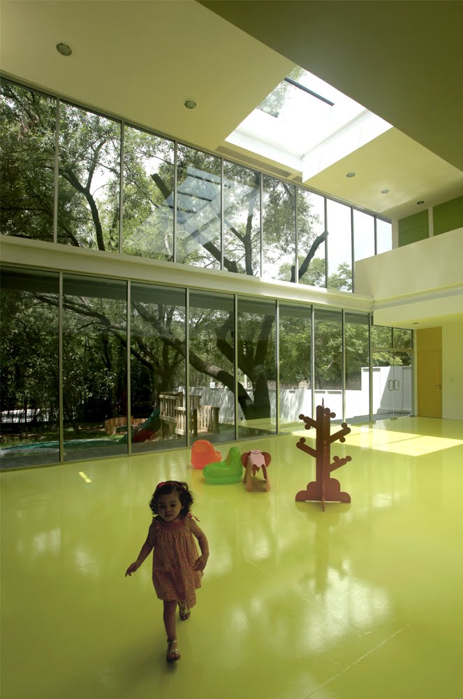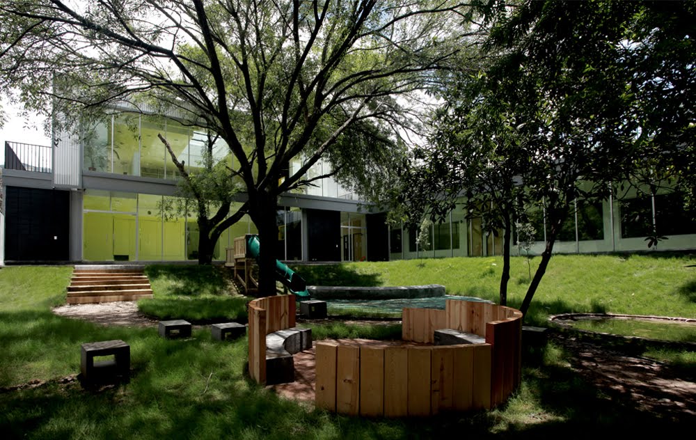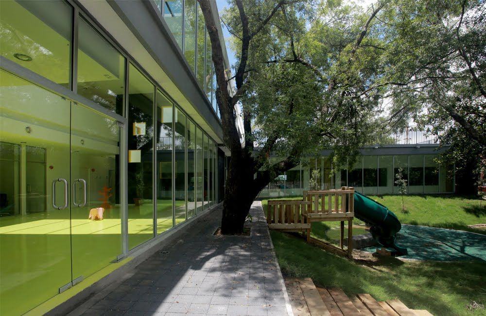 Lo más importante del proyecto era que el terreno en donde se construiría tenía una serie de árboles adultos muy antiguos ya que ese terreno se encuentra en una parte de la ciudad con apenas algunos años de desarrollo urbano, por lo cual se buscó posicionar estratégicamente el edificio para no tirar ninguno de estos árboles y generar un acceso al edificio con ellos para poder aislar el acceso del edificio con la calle generando un jardín de acceso y luego utilizarlo como un bloque en forma “L” abrazando el jardín interior y separando y delimitando el acceso vehicular del jardín y patio de juegos para los niños. El jardín es la parte central del proyecto y proyecta la sensación de estar en un pequeño bosque, el cual se filtra a través de grandes ventanales hacia el interior del edificio generando una relación constante entre actividades interiores y la naturaleza.