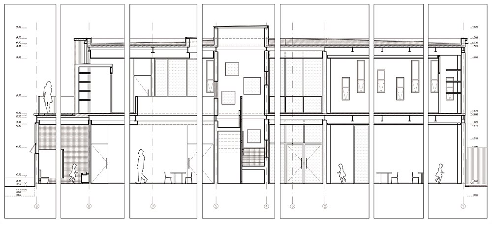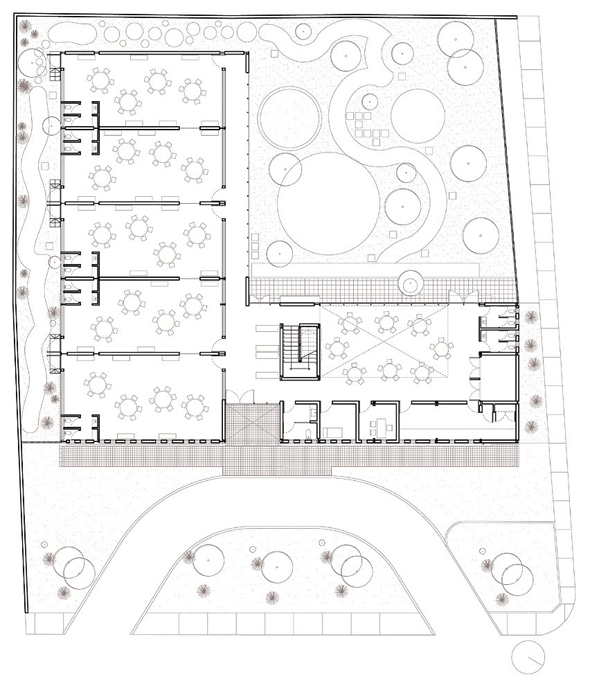 El programa contiene una crujía de servicios tanto en planta baja como en planta alta concentrando las instalaciones y liberando la mayor parte del espacio interior dándole flexibilidad de poder estar cambiando actividades en cualquiera de los dos niveles.