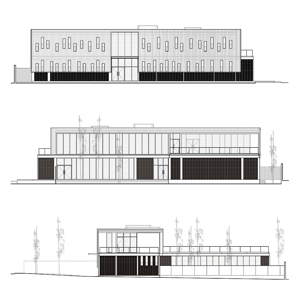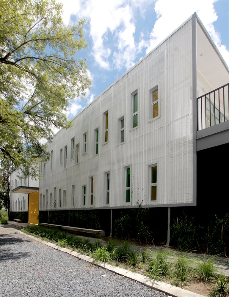Como acabado exterior se implementó una fachada ventilada, fabricada en base a láminas de acero onduladas y perforadas que rodean en su parte superior el edificio. Esta fachada se separa de los muros con una subestructura de montaje para generar movimiento de aire y ventilación entre el recubrimiento y el muro, así como proporcionar sombra a los muros y protección a la incidencia solar. Evitar el calentamiento de los muros exteriores es importante debido al clima extremoso de la ciudad de Monterrey.