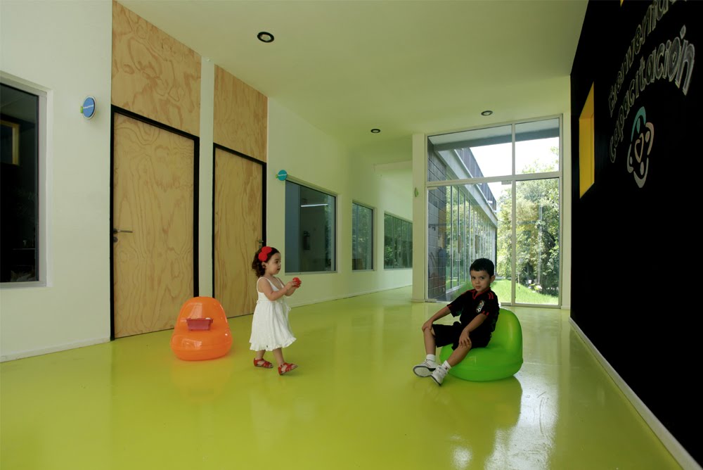 Un punto importante en el proyecto era generar la inclusión de los usuarios en el espacio, por lo cual en diversas partes interiores del edificio se localizan ventanas y superficies transparentes que conectan visualmente al usuario con diversas actividades. En todas las aulas existe una ventana de piso a techo para poder tener una relación entre aula y aula y entre aula y exterior, generando seguridad en los niños y conocimiento de que hay otros salones con niños quizás con mayor o menor edad dentro del edificio, lo cual estimula la convivencia y el respeto hacia otros grupos, creando una sola comunidad. Un pasillo conecta todas las aulas con el espacio común del edificio. Al caminar por este pasillo se puede tener contacto visual con los alumnos, esto para beneficio tanto de la directora de la escuela y las maestras, como para los padres de familia, ya que pueden observar el desempeño de sus hijos durante sus actividades. En el salón polivalente, se genera un espacio de convivencia, donde se tiene la idea de poder invitar a los padres a que participen en distintas actividades que tengan que realizar sus hijos, así como hacer reuniones, juntas y almuerzos al estar directamente relacionado con la cocina.