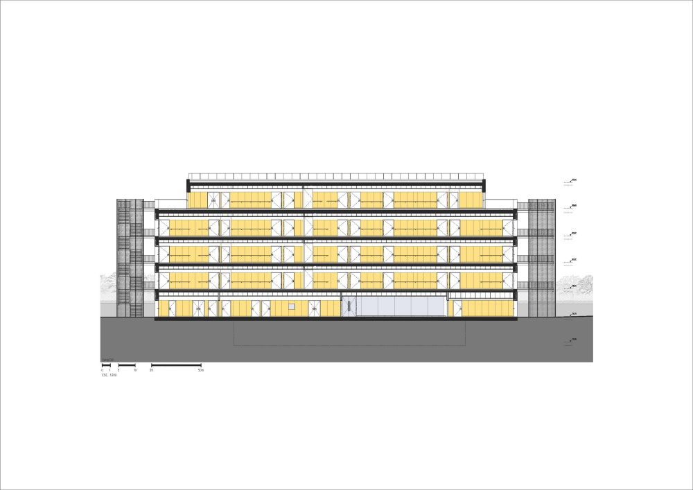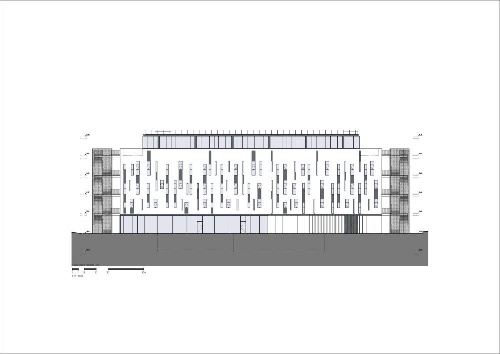 The result is verified in the reduction of windows, creating openings which were enough to illuminate each compartment and which allowed the creation of facades that were rhythmically marked by ‘rips’. This game offered a harmonious and contemporary visual to the building. All entrances have enhanced features either at a visual level or at a functional level. For instance, the peak that is associated to the main entrance does not only emphasize it, but also protects the users from outdoor climatic conditions. The same idea is actually applied to the entrance of patients since they are most frequented exterior areas. Furthermore, the use of a metallic pergola right at the exit of the mortuary house hides it from the closest surrounding areas.