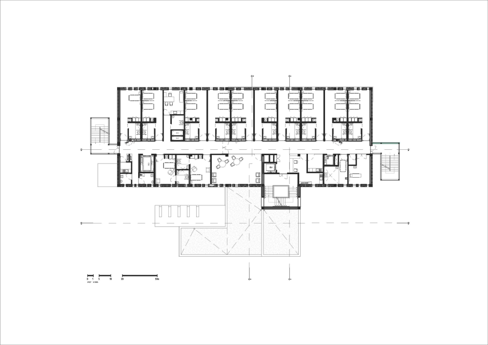The building is composed of 5 above-ground and one underground storeys and it has a capacity of 73 beds. Since it is about the regeneration of an existing building, the necessity fell in with the creation of a modern and sober image. therefore, the investment focused on the study of constructive solutions which would guarantee thermal insulation in facades, windows/ doors and roofs. These systems should contribute decisively for the resistance, durability, hygiene and easy maintenance of the entire complex. The new image of the Building results from the interpretation of various formal elements of the existent versus the aimed functionality of the program versus the various legislations in regard to specialities.