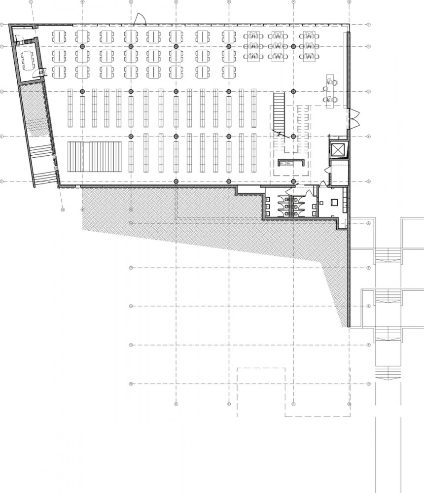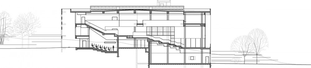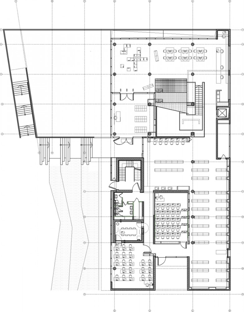 The entrance lobby, at the mezzanine level, is connected to the upper level in the central area by means of the fold; it is a system of terraces that create a sort of mini public space. An inner climbing street enables varied types of seating in this public space. This is the heart of the library, the center of social interaction, and it is directly connected to the book storage areas. We believe that this space will constitute a quality, inviting place for the students and that they will take advantage of its different spaces whenever they have free time. The area is created by combining spaces that function as informal sitting areas, the entrance lobby and the display of periodicals. It does not involve the addition of space beyond that defined in the general plan. We found a suitable location for a multimedia space under the fold, where a graduated space can serve for showing films. The planning concept regarding book storage allows broad flexibility. We propose four storage areas, however, because the space is open, and accessible from the central space it is perceived as a single homogenous unit. In addition, the compact method of storage enables use of these areas for social interaction.