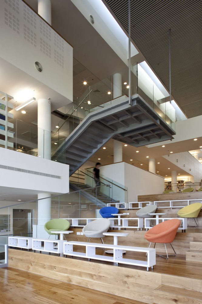 The visit to the project site on the day of the meeting included a short tour among the temporary structures and the hill, with its spectacular view. We believed that the best way to instill this spirit of “place” in the building is by integrating the idea of a walk in the proposal. The building arises from the ground like a topographic fold, and passing through its wings is a walk through nature in every sense. From the central public element that continues from the outdoor courtyard, through the fold that begins in the entrance lobby, the interior space is created and designed as a internal landscape. The center of the building is designed like a landscape element, and the movement within it is determined and organized in relation to the landscape. All these enable the organization, inside and outdoors, of special events for the entire campus (folk dancing, a student fair in the outer courtyard, films at the top of the inner ramp and more). The central area, the fold that climbs up, constitutes the hub of activity and the heart of the library. The space is built as a ramp (thus also providing access for disabled people), with informal sitting areas of varying sizes within it. It also serves as an additional means of access to the book storerooms.