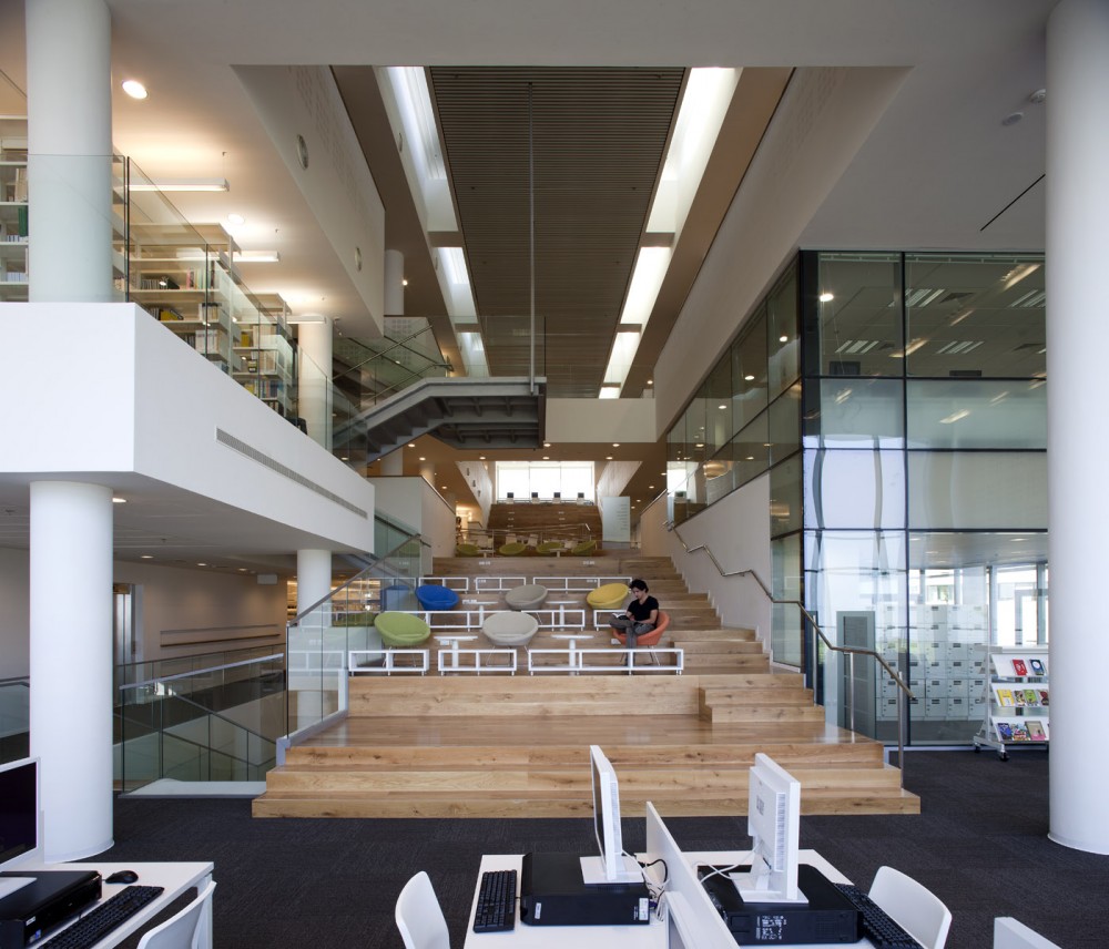 We sought a way to create a diverse, inspiring, dynamic space for situations of many types – from formal seating facing the pastoral landscape (a setting for maximum concentration) and group seating in the seminar rooms, studying at a computer and facing the landscape, to a comfortable environment for studying or sitting informally in groups. We wanted to organize the different situations so that they support one another, together creating a student experience on campus. The resulting was the creation of a ground level with an uninterrupted panoramic view of the magical Sea of Galilee. This level is connected to the entrance level by stairs and an elevator, but otherwise it has no spatial connection to the library space. This is the place that offers the best conditions for studying and concentrating.