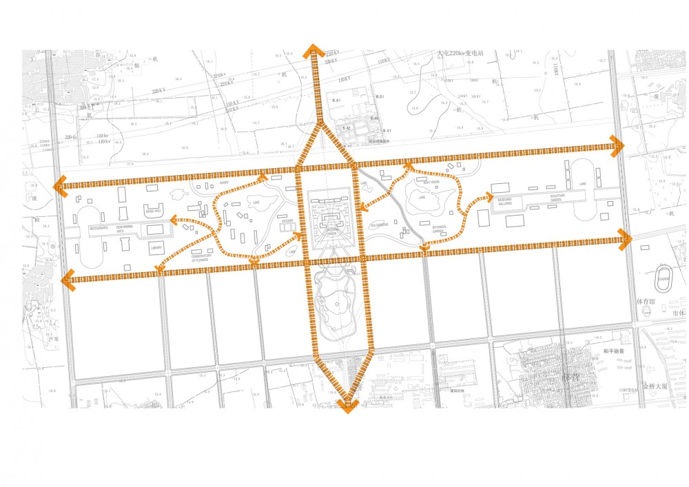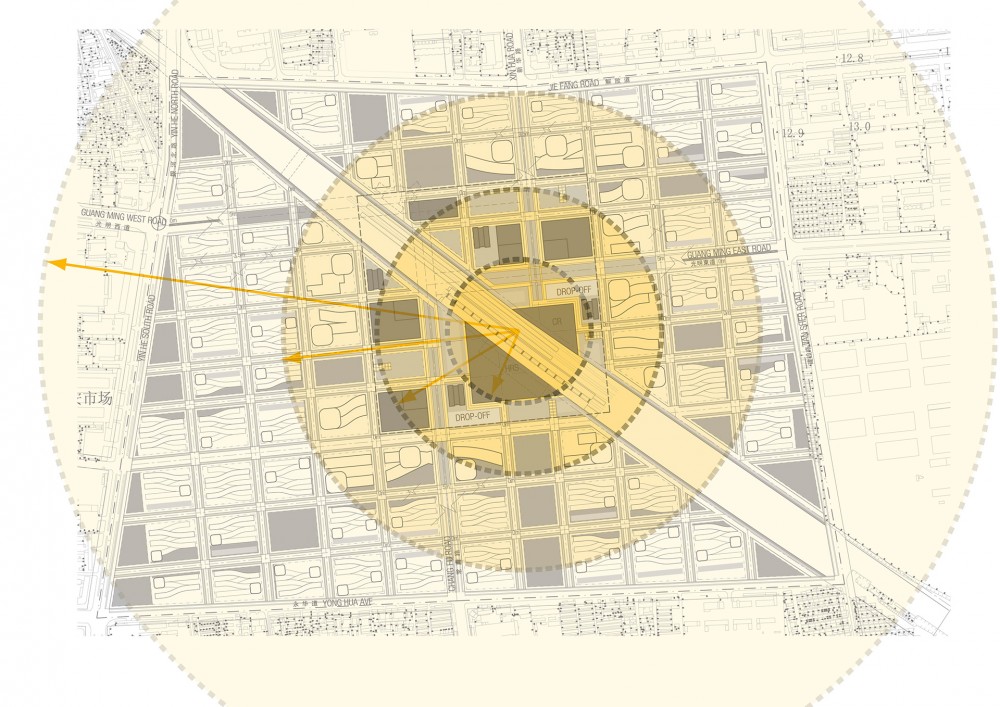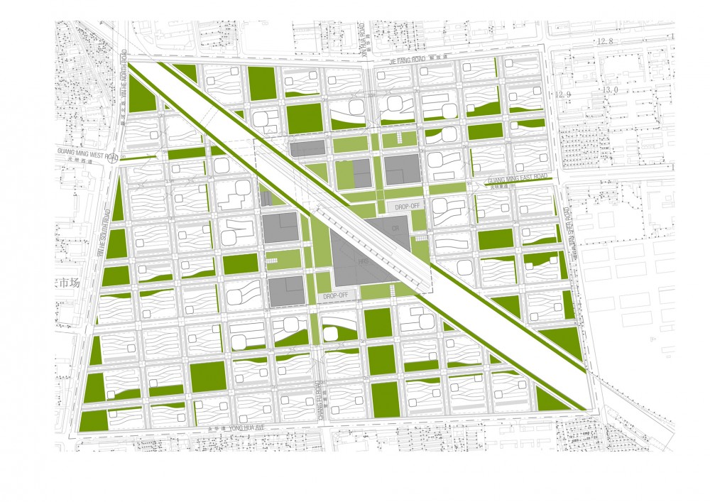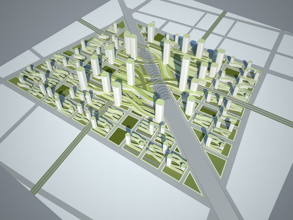Three key elements comprise the plan: a City Center Transportation Hub, a Northern Gateway Cultural Corridor, and an extensive wetland and aquifer system. Located in the heart of the city and bridging the high speed rail-line, the transportation hub weaves together transit systems, living infrastructure, and compact development to create a pedestrian-scaled, multi-tiered canopy for working and living. Marking the city’s northern gateway, the Cultural Corridor provides a respite from the density of the city center, offering low-rise, residential blocks, world-class cultural institutions, and a vast, 376-hectare park devoted to ecological restoration.