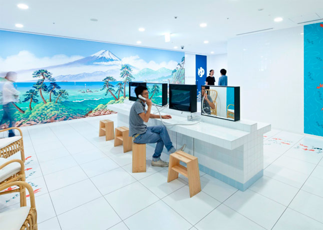 En el interior de las oficinas se hallan salas inspiradas en los baños públicos japoneses o en los estanques tradicionales y cuentan con grandes murales que evocan el folclore local y símbolos como el Monte Fuji.