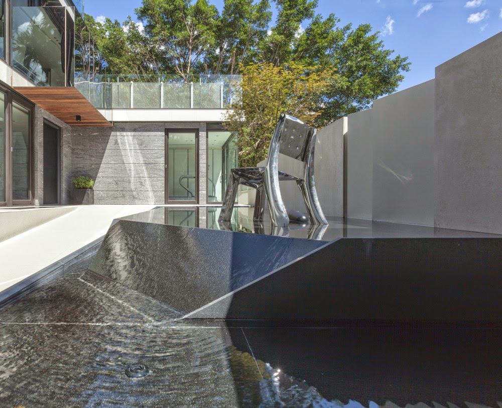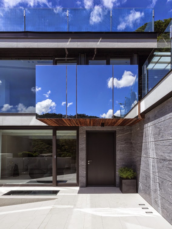 El cubo que se extiende desde la fachada es un espacio intermedio entre el interior y exterior, mientras que el acero inoxidable refleja el azul del cielo y la arquitectura se funde con la naturaleza.