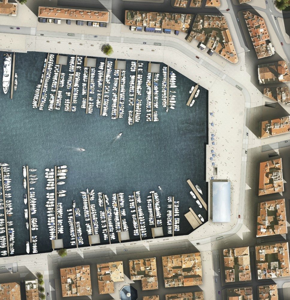 In order to enlarge the space for pedestrians, the technical installations and boat houses on the quays will be replaced with new platforms and clubhouses over the water. The harbor will be landscaped with a pale-colored granite, which echoes the shade of the original limestone cobbles.