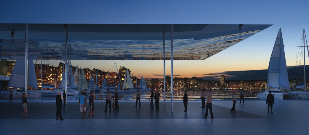 At Quai des Belges, the prominent eastern edge of the harbor, a dramatic blade of reflective stainless steel will shelter a flexible new events pavilion. Open on all sides, its 46 by 22 meter canopy is supported by slender pillars. The canopy’s polished, mirrored surface reflects the surrounding port and tapers towards the edges, minimizing its profile and reducing the structure’s visual impact.
