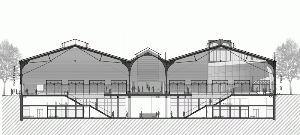 El edificio original, de alrededor de 3.500m2, ha sido ampliado a través de la adición de dos niveles más bajos para alcanzar una superficie bruta total de 9.045m2. El proyecto de studioMilou propuso la construcción de una planta baja que pudiera revelar la belleza que ofrece el mercado original y dos niveles subterráneos, uno con un altillo para las instalaciones técnicas del edificio, y un nivel más bajo de techo alto con nuevas instalaciones para el deporte, la danza , y un estudio de sonido y grabación. Hay un auditorio para 250 personas, en el nivel de planta baja, utilizando un diseño redondeado que hace hincapié en su carácter de adición contemporánea.