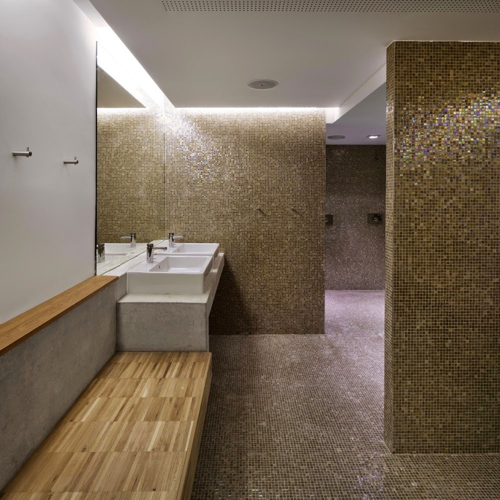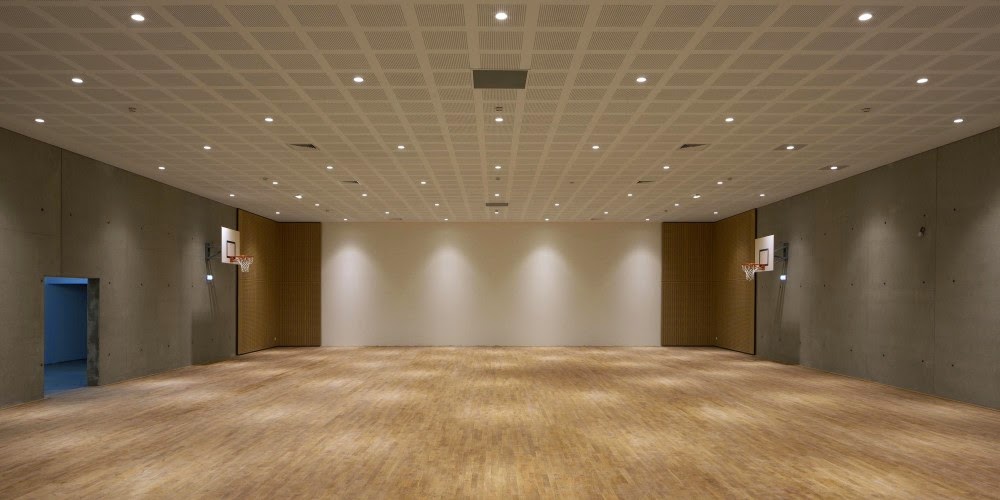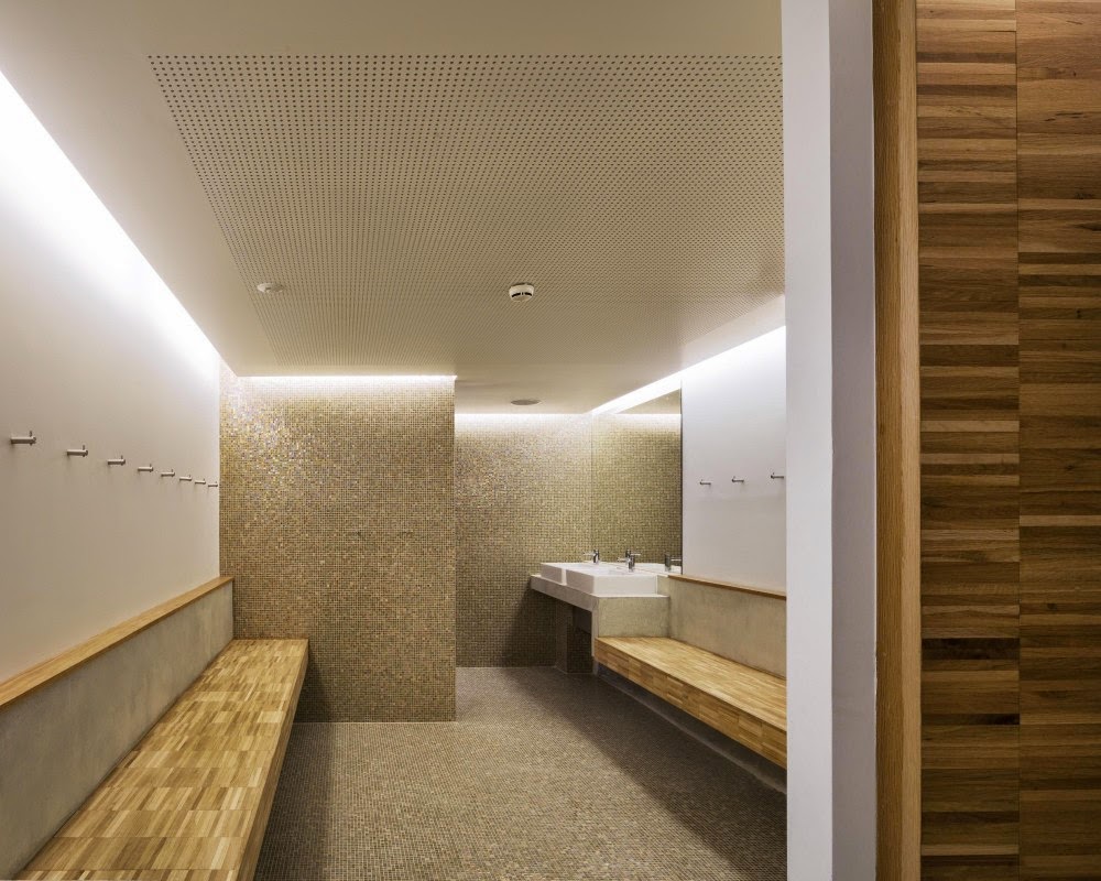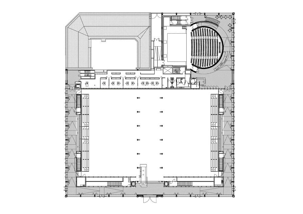 En la parte superior del edificio, el uso de marcos de acero (de ancho limitado), como escenario de paneles de doble acristalamiento, ha permitido que la relación original entre los espacios vacíos y llenos se conserve, mientras que al mismo tiempo cumpla con las limitaciones acústicas y térmicas actuales requeridas para este tipo de instalaciones. Se ha utilizado roble de color claro a lo largo de las terminaciones interiores, una elección hecha en la recomendación de las autoridades, con el fin de ver las intervenciones arquitectónicas contemporáneas en el edificio claramente marcadas como tales.