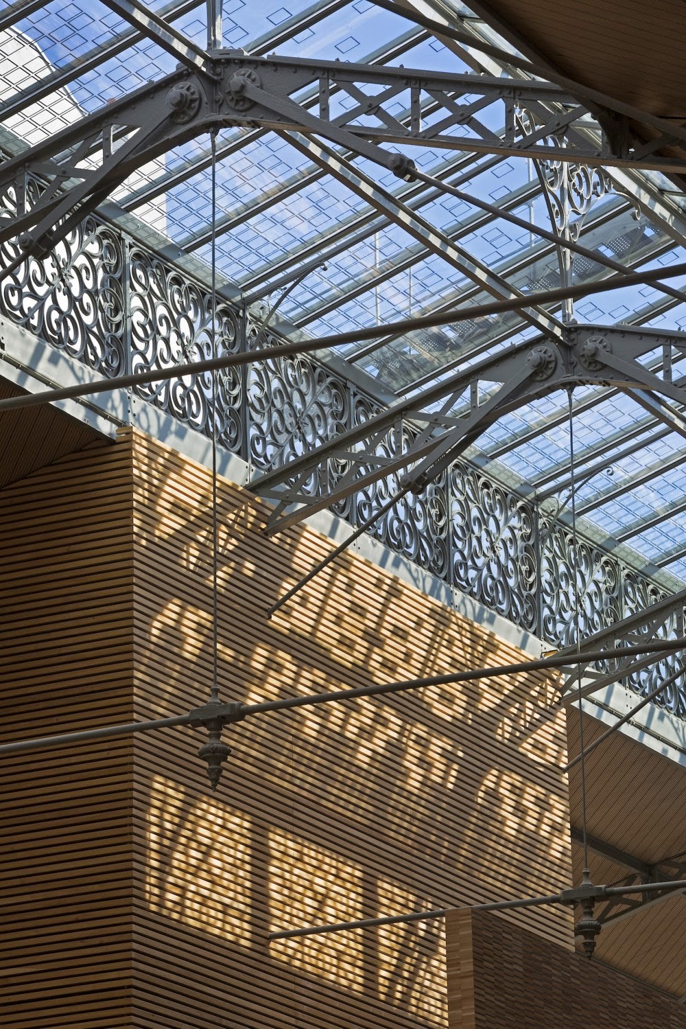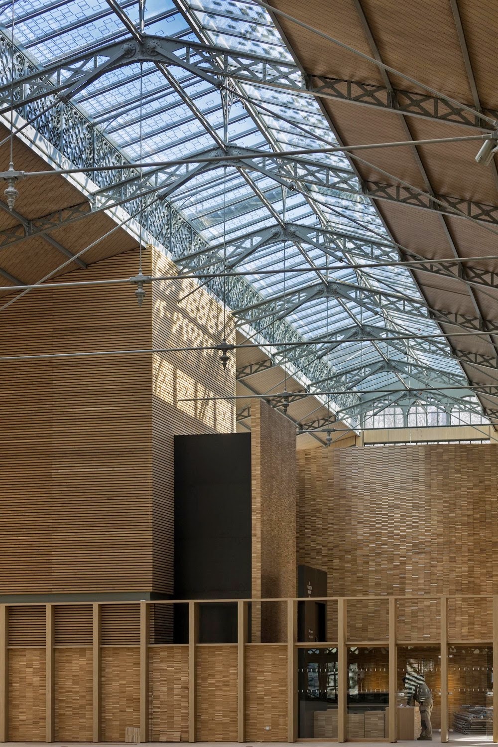 Dentro de las salas, se instaló una segunda piel de paneles de roble a 45 cm de distancia de los arcos metálicos y pilares exteriores. Esto permite que el edificio cumpla con todas las regulaciones térmicas y acústicas pertinentes. El acristalamiento original de los techos se ha sustituido completamente por nuevos elementos de doble acristalamiento con marcos de acero, limitados en ancho. El aspecto general del zinc del revestimiento se ha conservado, lo que permite que el carácter parisino de los techos de las tres salas y la totalidad de la estructura interior de los pabellones se conserven.