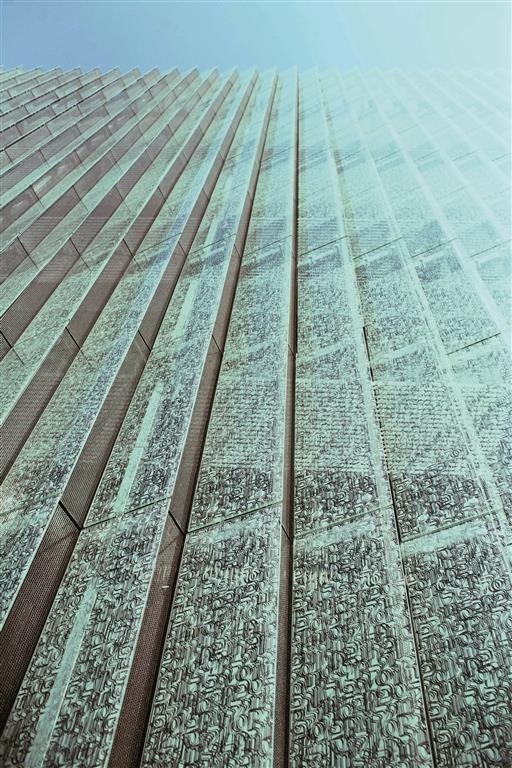 La fachada del edificio está compuesta por cristal y cobre que crea una interacción dinámica de luz y forma. Los paneles de cristal están decorados con letras de los alfabetos latino y hebreo, formando la palabra “Polin”, el término hebreo para Polonia.