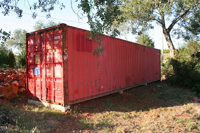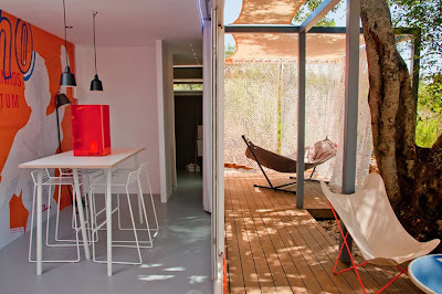 studio arte has been exploring the notion of nomad living in their architectural practice, resulting in a series of shipping container structures that they see serving a multitude of purposes: a start up for young home owners, a holiday home, a concept for holiday resort planners, a shed for guests, a home office, a home studio, a pop-up, or a hotel room. one of the first prototypes they have realized is situated in the picturesque region of algarve, portugal, where the experimental firm has transformed a single standard shipping container module into a getaway retreat. boldly painted in orange to compliment the lush surrounding greenery, the structure features a wide deck that runs along the entire frontage of the dwelling, extending the narrow space outwards thus opening up the interior to the exterior via large glass sliding doors. the shelter includes living, eating, and wash areas and responds to the site’s local bureaucratic building regulations. ‘nomad living’ is a mobile, sustainable and economical getaway–a functional shell that can be transformed by adding various architectural, mechanical and engineering features.