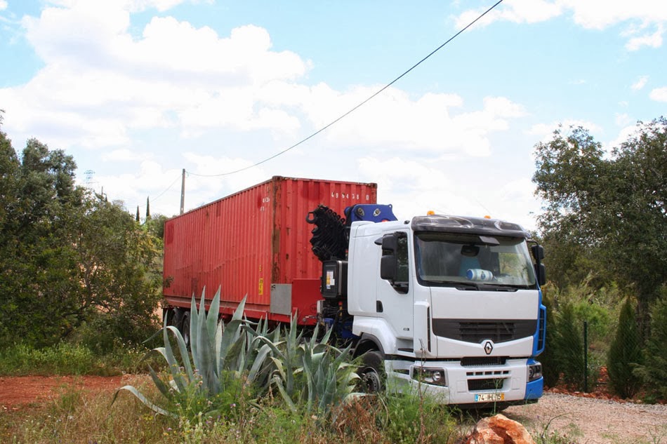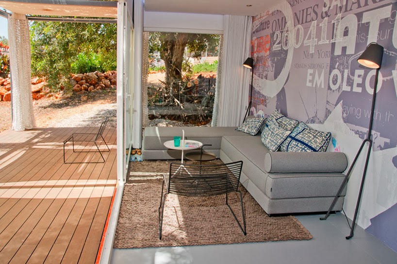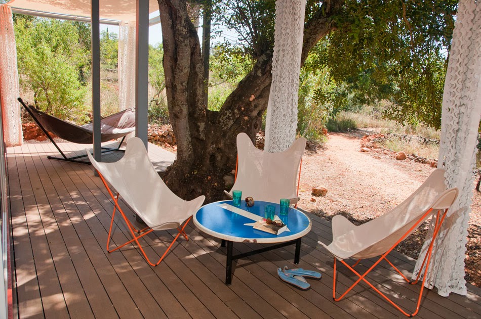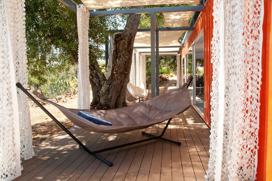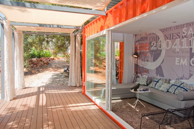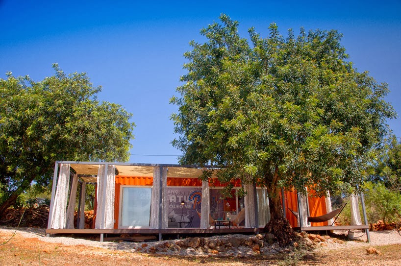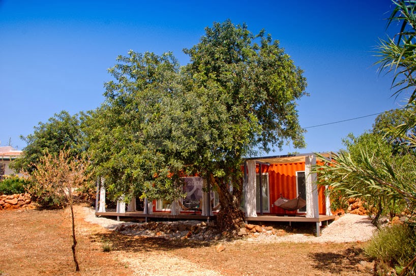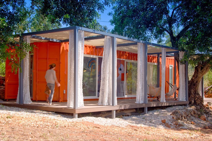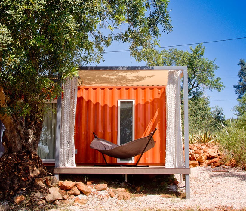 studio arte has been exploring the notion of nomad living in their architectural practice, resulting in a series of shipping container structures that they see serving a multitude of purposes: a start up for young home owners, a holiday home, a concept for holiday resort planners, a shed for guests, a home office, a home studio, a pop-up, or a hotel room. one of the first prototypes they have realized is situated in the picturesque region of algarve, portugal, where the experimental firm has transformed a single standard shipping container module into a getaway retreat. boldly painted in orange to compliment the lush surrounding greenery, the structure features a wide deck that runs along the entire frontage of the dwelling, extending the narrow space outwards thus opening up the interior to the exterior via large glass sliding doors. the shelter includes living, eating, and wash areas and responds to the site’s local bureaucratic building regulations. ‘nomad living’ is a mobile, sustainable and economical getaway–a functional shell that can be transformed by adding various architectural, mechanical and engineering features.
