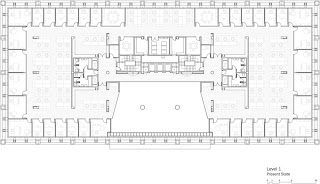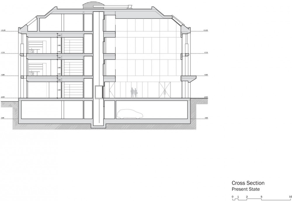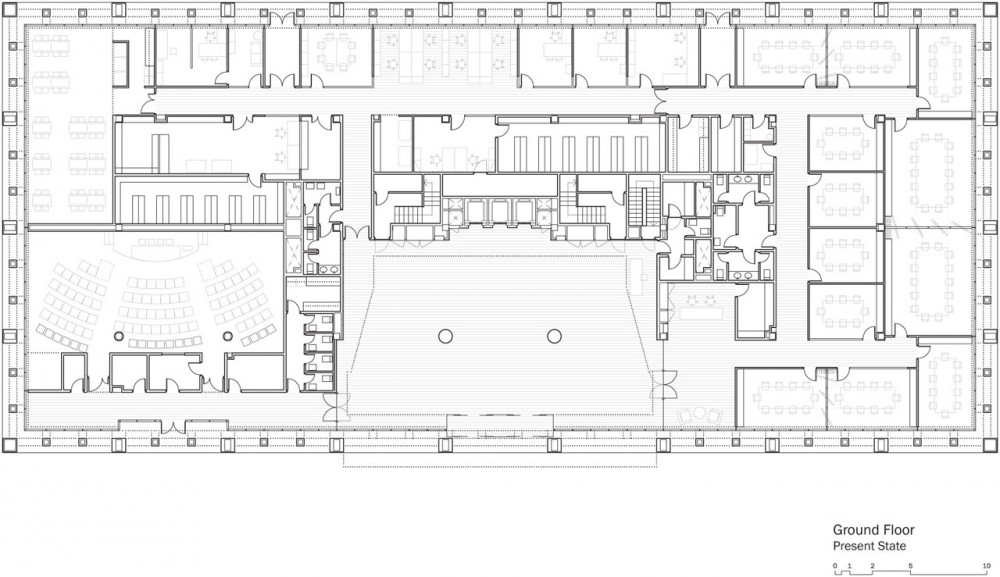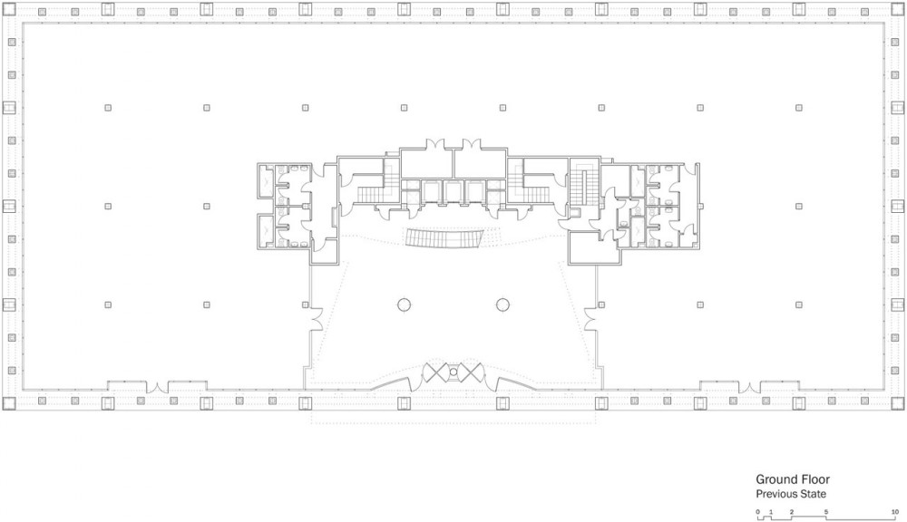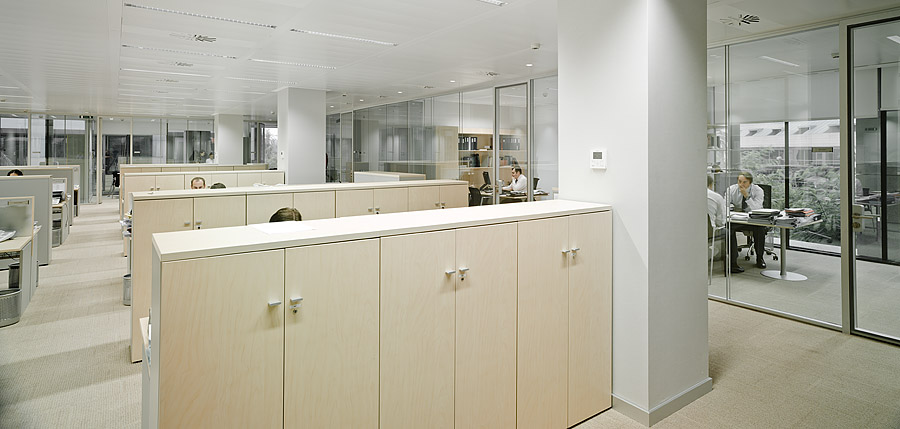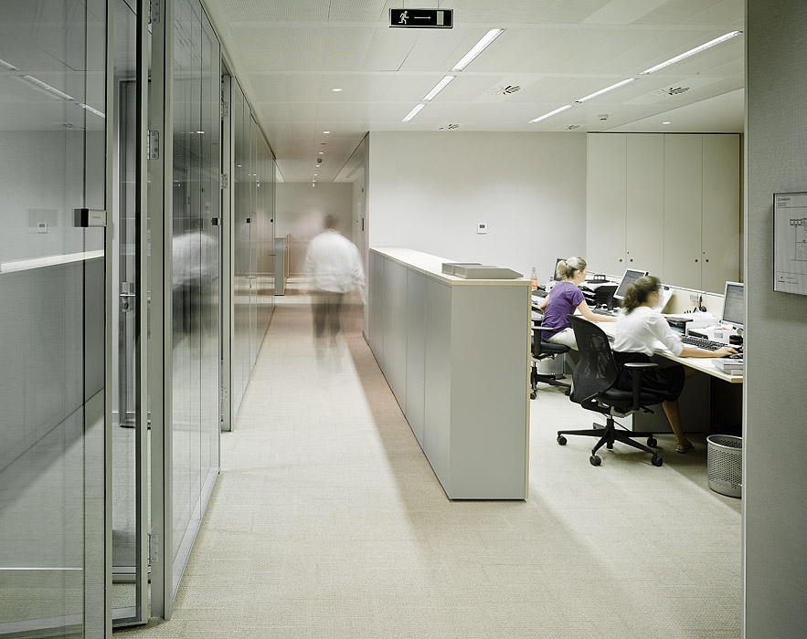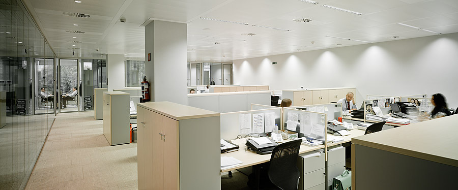 Por último, el programa se distribuyó priorizando el uso público de la planta de acceso, dedicando la mayor parte de su espacio a la recepción, atención de clientes, salas de reunión y espacios de actos y presentaciones. En el resto de plantas se concentran los espacios de trabajo, disponiendo los despachos cerrados perimetralmente a lo largo de las fachadas y dejando los espacios centrales para espacios de trabajo abierto, salas de apoyo, archivos y comunicaciones.
