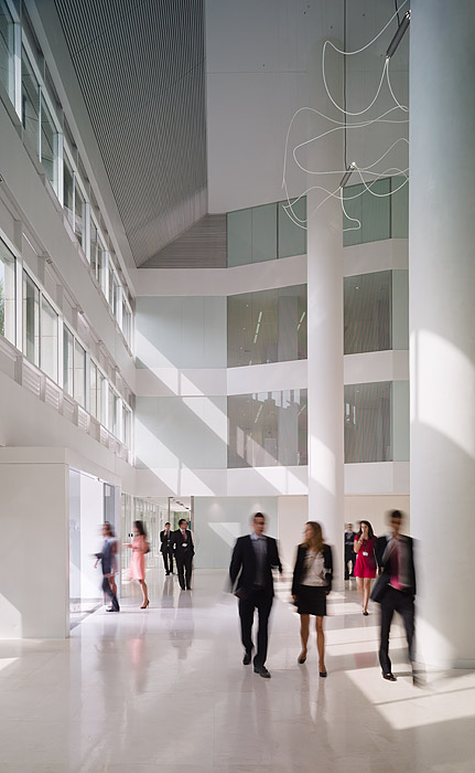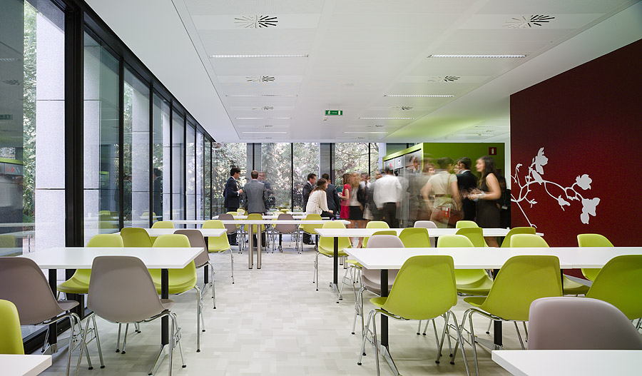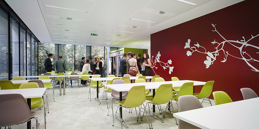 En cuanto a las decisiones de diseño, al tratarse de un edificio de oficinas con una estructura muy presente tanto en el interior como en las fachadas exteriores, el mayor esfuerzo de la intervención ha consistido en la eliminación de aquellos elementos que impedían una lectura clara, tanto de los accesos como de las comunicaciones o los espacios. En este sentido, la intervención sobre el atrio de entrada se convierte en una de las operaciones más importantes de la rehabilitación, cediendo todo el protagonismo al espacio, a la luz y a la unificación de colores y materiales, para que a través de su escala se identificara la representatividad de la firma.