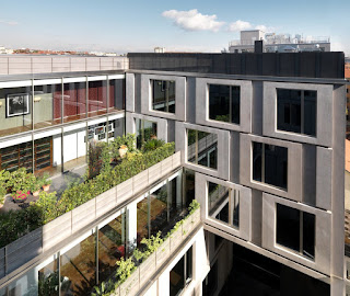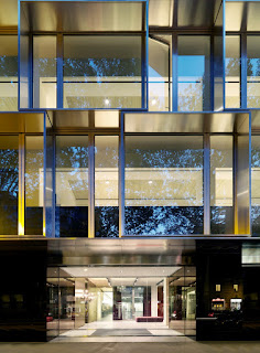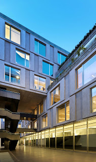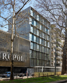 El estilo se utiliza para el frente de la calle, que transmite una sensación de ligereza y transparencia a través de la utilización de vidrio y metal, contrastando con el estilo más austero de las fachadas interiores. Aquí el tema de módulos cuadrados de la fachada se repite en Viale Piave, en el tamaño y la geometría, pero hecha de hormigón reforzado con vidrio (GRC), con puertas y ventanas de vidrio.