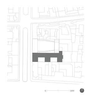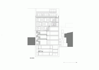 La compleja estructura del edificio refleja la variedad de usos de los espacios, con oficinas, áreas para la recepción de invitados y entretenimiento y las áreas de coordinación para la preparación de desfiles de moda ubicados en diferentes pisos, y con zonas comunes y salas de reuniones en la planta baja, que dan al patio.
