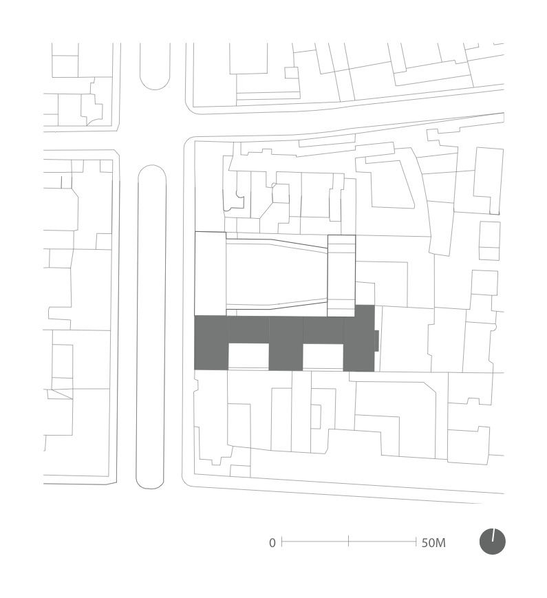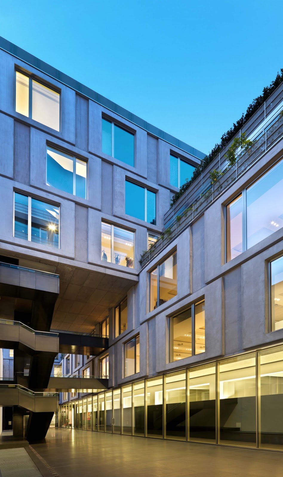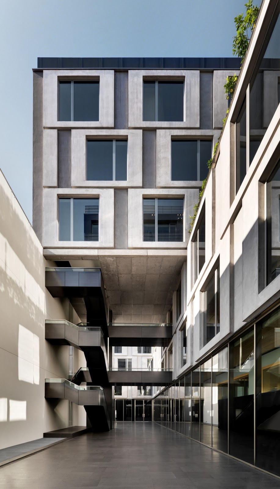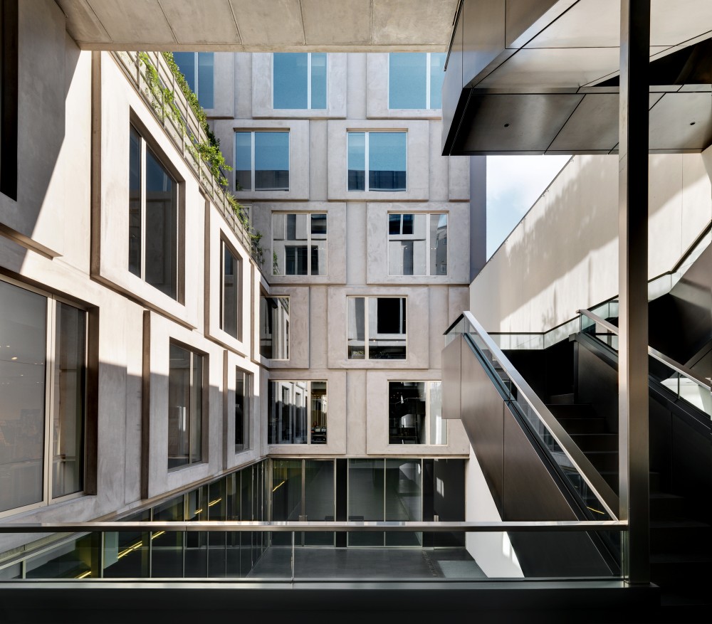 La compleja estructura del edificio refleja la variedad de usos de los espacios, con oficinas, áreas para la recepción de invitados y entretenimiento y las áreas de coordinación para la preparación de desfiles de moda ubicados en diferentes pisos, y con zonas comunes y salas de reuniones en la planta baja, que dan al patio.